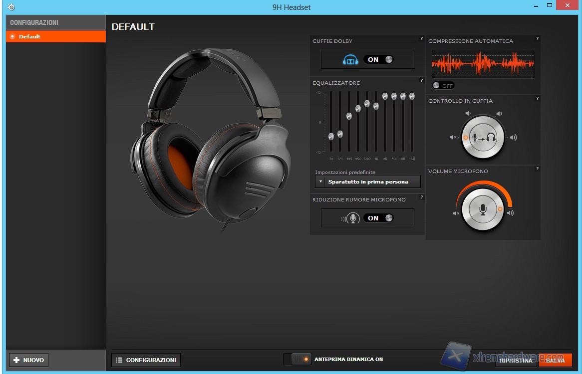 Ora, con un doppio click sulla Tab del prodotto accederemo al pannello di configurazione e potremo personalizzare o abilitare ogni voce relativa alle Steelseries 9H. In questo caso potremo abilitare, partendo dall’alto, il Dolby Logic IIx oppure attivare la compressione del suono. Non mancano i preset di base che spaziano da quello personalizzato, in cui potremo agire sull’equalizzatore e variare ogni frequenza, a quello film, musica, MMO, prima persona e così via. Non mancano le opzioni per regolare il volume del microfono sia in cuffia che quello diretto per la chat vocale. Per le 9H ci viene messo a disposizione anche l’opzione per abilitare o meno il controllo rumore sul microfono per ridurre al minimo i rumori di sottofondo che potrebbero dare fastidio all’interlocutore durante una chat vocale.
