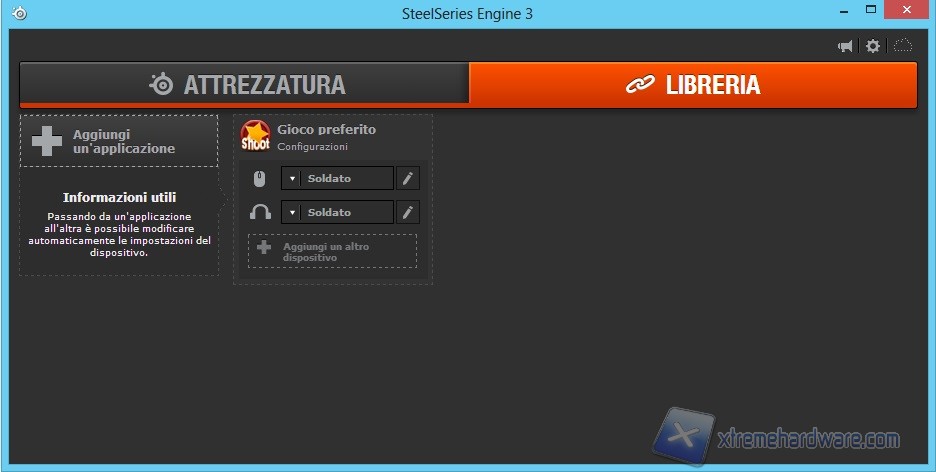Sempre da questo schermata protremo ricercare aggiornamenti per il programma cliccando sulla prima icona in alto a destra; la seconda icona ci permetterà di impostare la lingua e scegliere se avviare o meno il programma con l’avvio del sistema operativo mentre l’ultima, ovvero lo Steelseries Cloud (ancora in fase beta), ci permetterà dopo aver creato un account di accedere ad un supporto diretto per i prodotti, personalizzare i profili caricati online delle proprie periferiche, avere la possibilità di essere seleszionato come Beta Tester per nuovi prodotti e molto altro. A lato della Tab Attrezzatura troviamo la Tab Libreria che ci permetterà di caricare un’applicazione ed i relativi profili precedentemente creati nella Tab relativa al prodotto come in questo caso le Steelseries 9H o il mouse Rival.