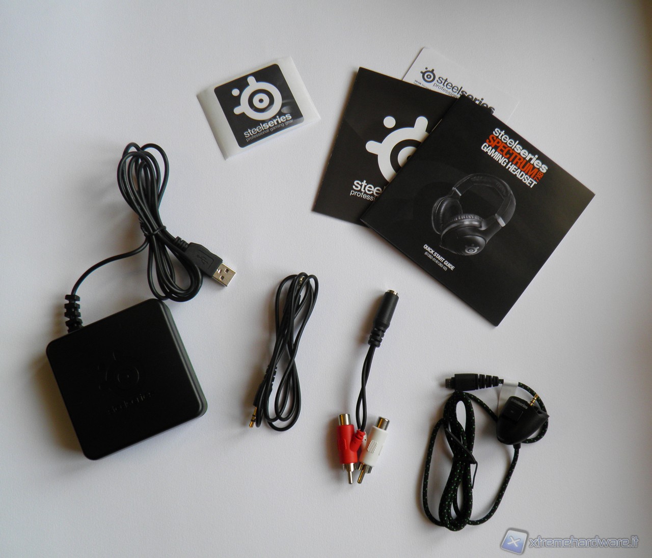 Nella confezione troveremo il manuale di utilizzo (italiano compreso), l'adesivo, il box ricevitore per le cuffie da connettere tramite USB e cavo audio con jack da 3.5 mm (sempre compreso nel kit placcato oro), cavo con jack 3.5mm femmina e 2 connettori RCA maschio/femmina per l'audio (per connettere le cuffie all'uscita del televisore) e infine il cavo per il funzionamento del microfono, con regolatore di volume e interruttore di funzionamento da collegare al gamepad della XBOX.
