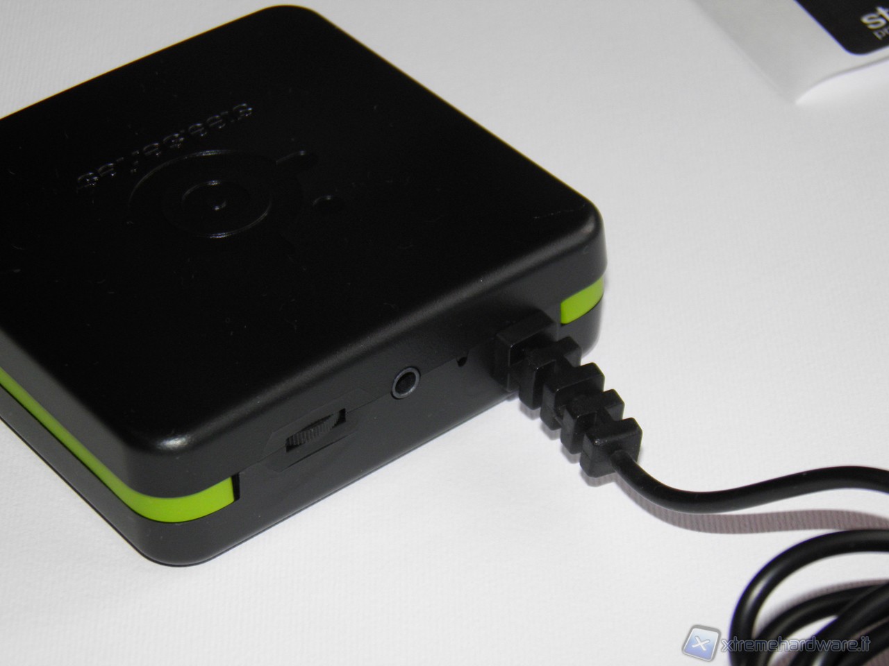 Il ricevitore è ,invece, realizzato con una plastica bucciata nera, sulla parte superiore la fa da padrona il logo SteelSeries. Una linea verde centrale riprende i colori della XBOX.