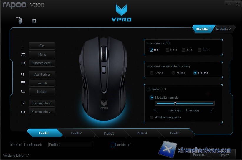 Nella prima schermata abbiamo subito la possibilità di modificare quasi tutti i parametri e funzioni relativi al mouse. Ricordiamo che il mouse è dotato di una memoria on-board per cui una volta salavate le modifiche e collegato il mouse su un altro PC avremo sempre gli stessi settaggi senza dover riscaricare il software per personalizzare le funzioni. Nel dettaglio troviamo una classica immagine del mouse dalla quale cliccando su diverse zone potremo vedere il numero corrispondente e a seguire nella parte sinistra assegnare funzioni base o avanzate o disattivare completamente il tasto nel caso fossimo amanti della semplicità. Spostandoci sul lato destro troviamo la possibilità di settare i DPI ed il Polling Rate. Per i DPI come vediamo abbiamo rimosso le altre risoluzioni e lasciato solo quella degli 800DPI. Ciò ci permetterà di lavorare con una sola risoluzione. Infine troviamo la voce “Controllo LED” dalla quale potremo personalizzare la retroilluminazione. Nel dettaglio potremo agire su quattro regolazioni “Illuminazione Spenta”, “Lampeggiante Lento”, “Lampeggiante Veloce” ed infine “Sempre Acceso”. Starà a noi scegliere quale settaggio impostare. Ricordiamo che la retroilluminazione è relativa al singolo colore arancione, unico colore disponibile. Non manca infine la possibilità di creare due Modalità differenti e di salvare fino a 5 profili differenti. Al solito il software ci permette di collegare il profilo ad un eseguibile di un gioco in modo da avere le impostazioni già caricate.