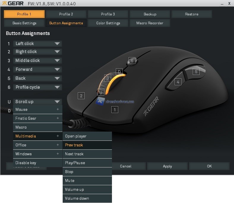 Nella parte alta troviamo i 5 Profili che potremo personalizzare da tale software di gestione e alcune voci che ci permetteranno di effettuare un Backup, un Restore dei profili salvati, un ripristino ai parametri di fabbrica in caso di problemi e i classici tasti per confermare o meno le modifiche. Insomma tutto ciò che abbiamo già visto con la tastiera RUSH.