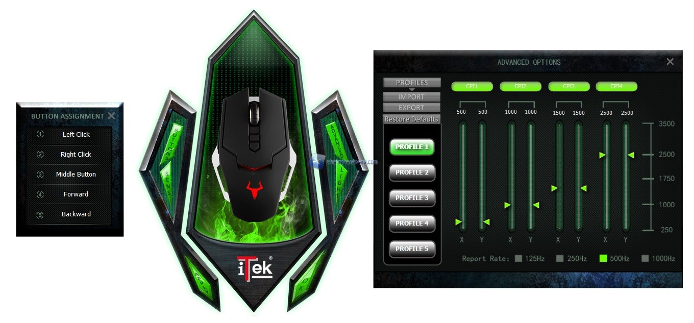 Cliccando i tasti laterali potremo aprire uno o due Menù/Finestre alla volta. I Menù superiori ci permetteranno di accedere all’assegnazione dei 5 tasti del Mouse e ai Profili DPI.