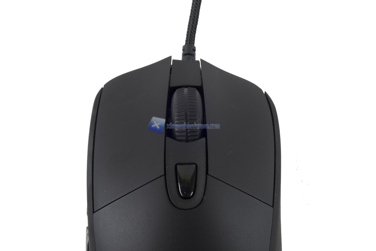 Avanzando verso il centro e zona centrale troviamo un tasto per il cambio DPI, la rotellina di tipo cliccabile con rivestimento gommato ed infine due tasti principali dotati di switch Omron tensionati tramite molla. Ciò riduce la forza necessaria e fornisce un'eccezionale uniformità di risposta.