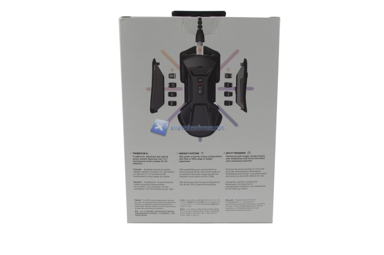 Lo SteelSeries Rival 600 ci giungerà in una confezione di cartone con grafica astratta di SteelSeries. Su di questa vengono riportate diverse immagini illustrative, tra cui una come esploso del sistema di installazione e customizzazione del peso del mouse, e le caratteristiche/specifiche del prodotto.