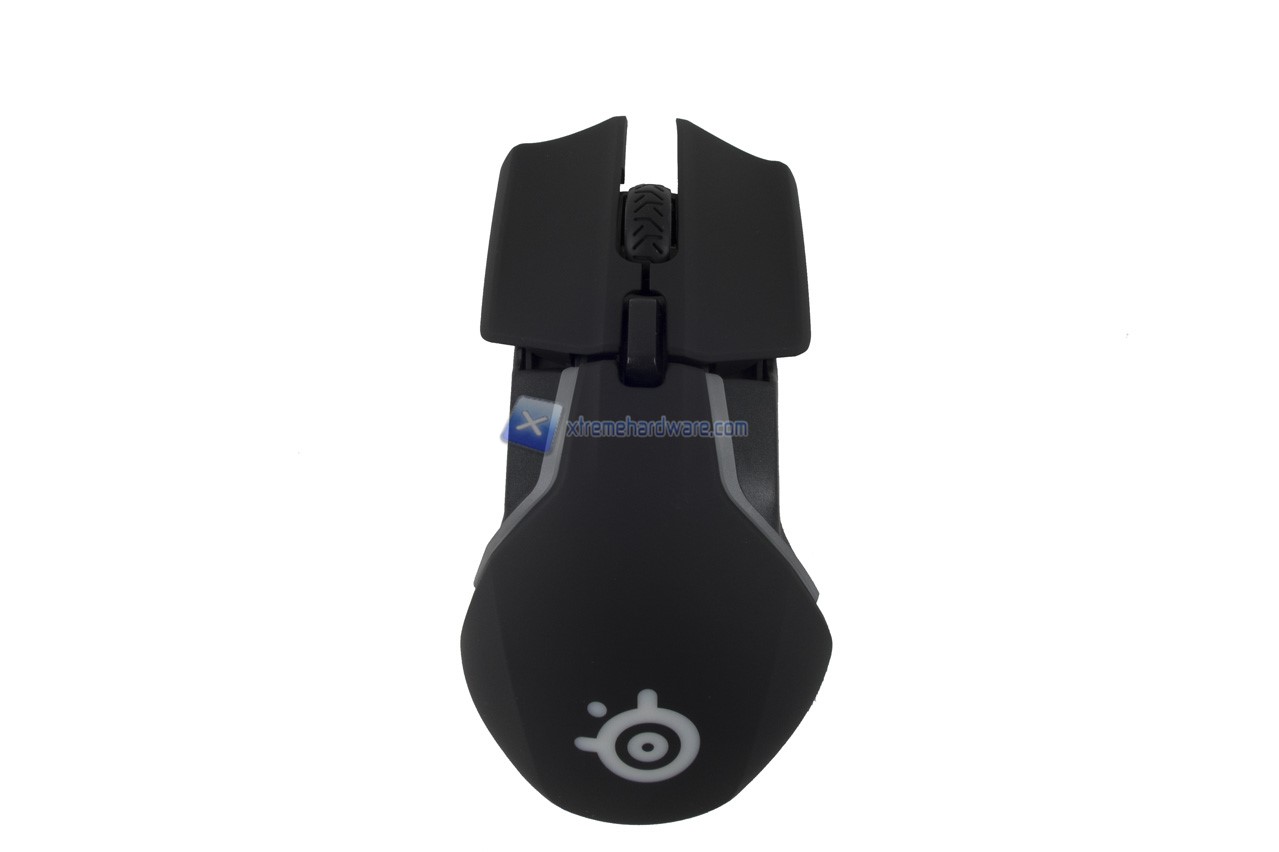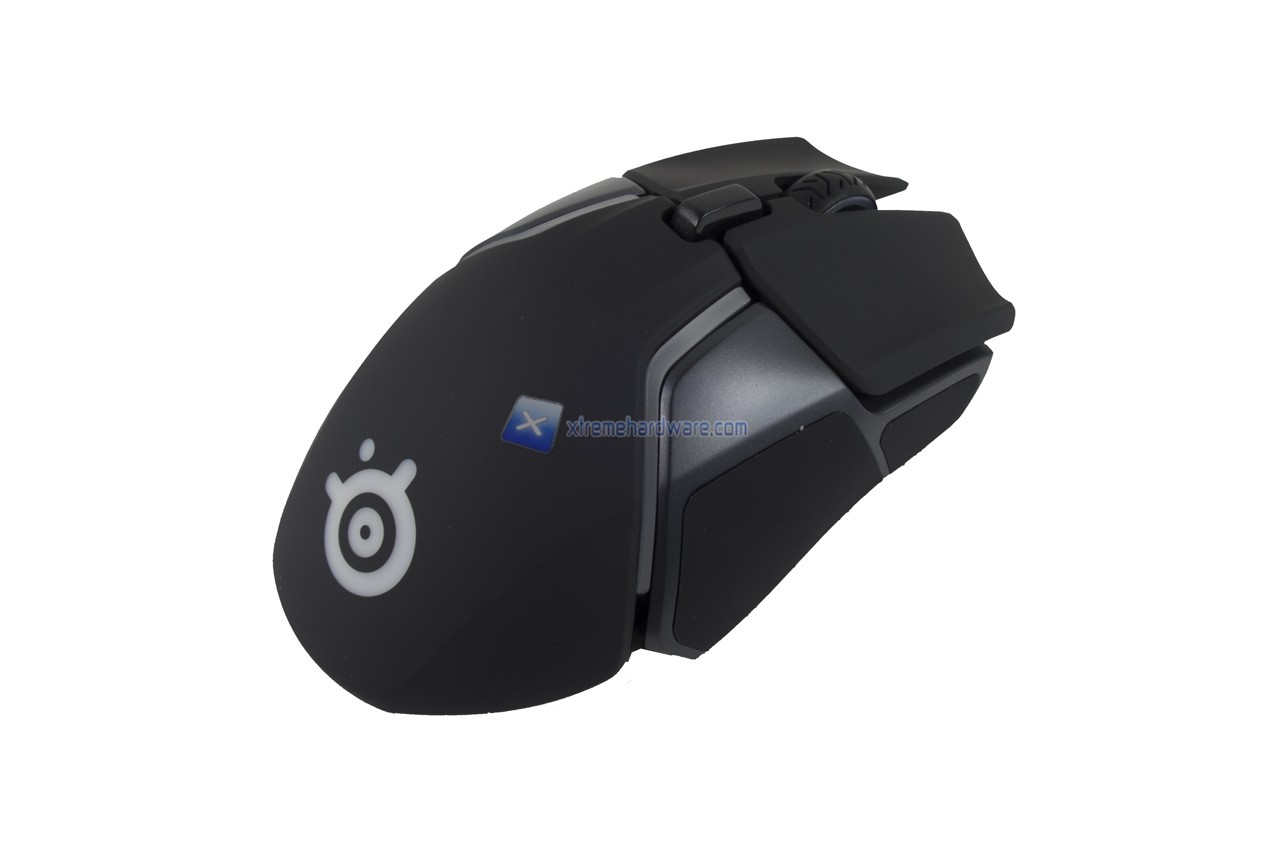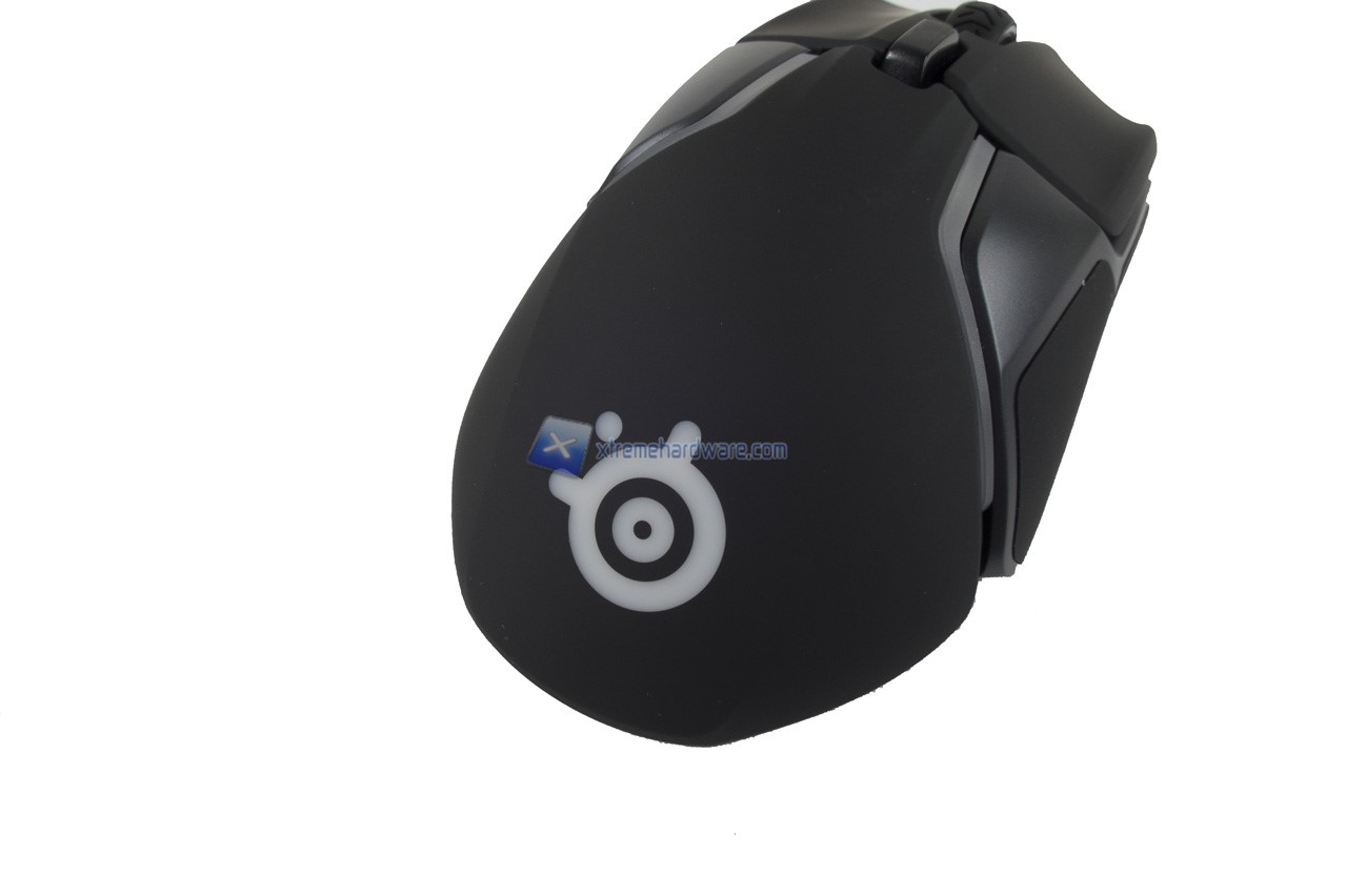 Partendo come di consueto dal dorso del mouse possiamo osservare il logo della SteelSeries.