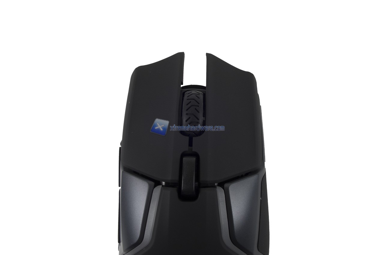 Proseguendo verso la zona frontale abbiamo un singolo tasto per lo switch tra i due profili DPI, classici di SteelSeries, e due altrettanto tasti principali con relativi switch Omron. Notare come i tasti siano separati dal resto della scocca. Infine non manca una rotellina di tipo cliccabile con rivestimento in gomma.