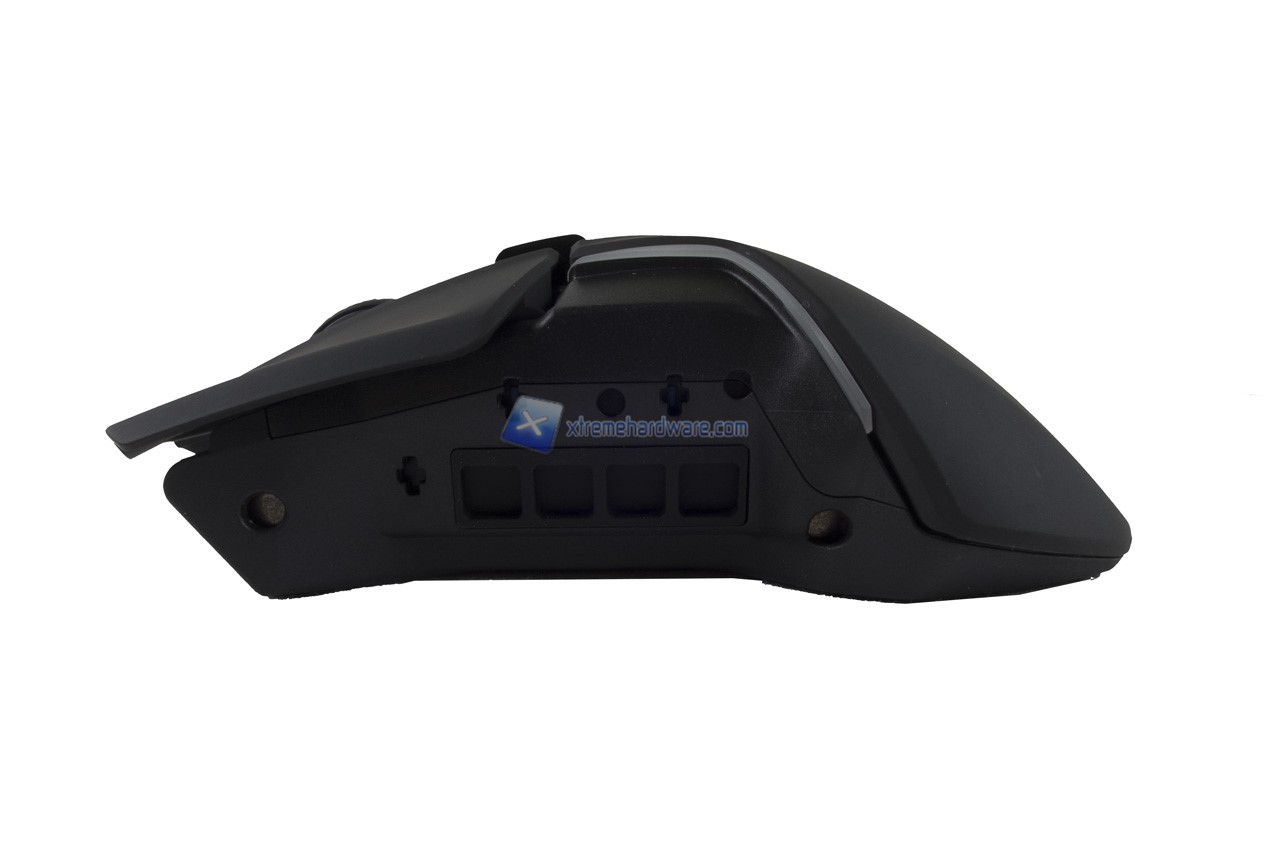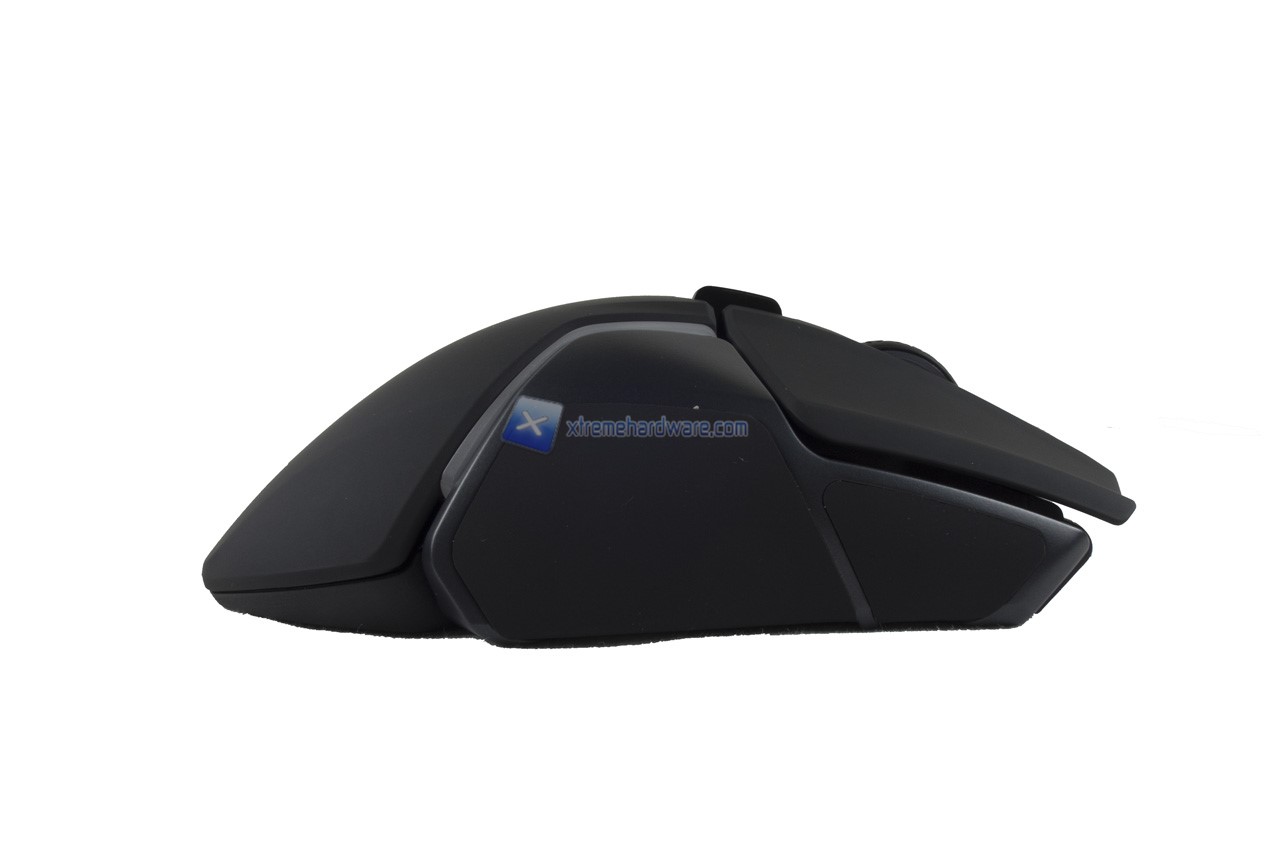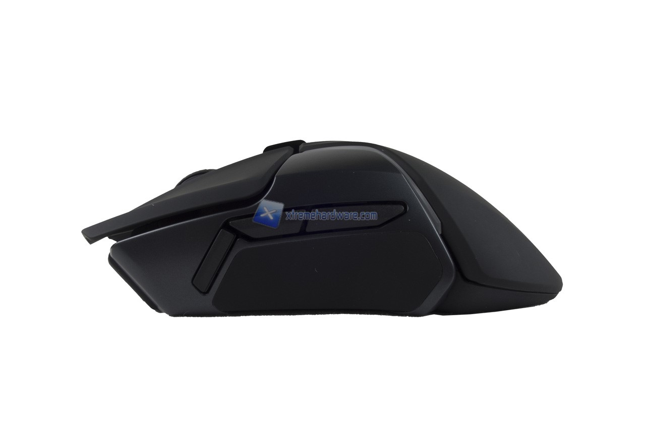 Il lato opposto presenta la medesima superficie Soft Touch ma non i tasti. Il Rival 600 è un mouse ergonomico per destrorsi.