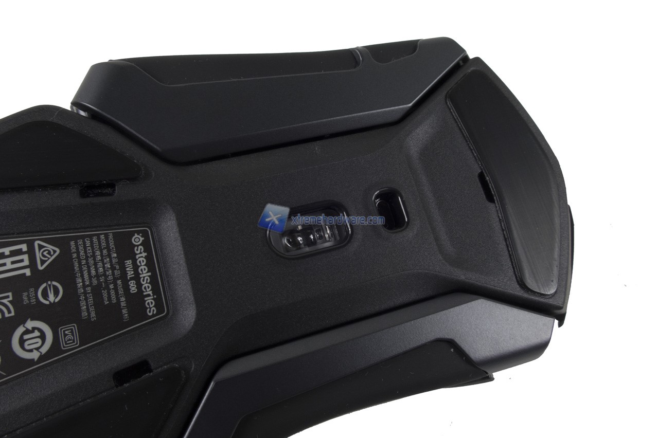Capovolgendo il mouse invece possiamo notare i tre mousefeet in PTFE più il consueto adesivo con ulteriori informazioni e infine i due sensori ottici. Il principale posizionato centralmente è un TrueMove3+ ovvero un Pixart PMW-3360 da 12.000 DPI massimi. Sensore che già conosciamo ampiamente. Poco più sopra troviamo il secondo sensore. Un sensore di ‘’profondità’’ adibito esclusivamente alla regolazione del valore di LOD (Lift-Off Distance). Potremo impostare questo valore da un minimo di 0,5 mm ad un massimo di 2 mm. Nel software SteelSeries Engine 3 troveremo solo Basso o Alto passando per delle tacche intermedie. Tale peculiarità e esclusività permette una maggiore personalizzazione e prestazioni in game per il Rival 600 per coloro che utilizzano pochi DPI, muovono e alzano di conseguenza molto il mouse e richiedono alcun ulteriore movimento/tracciamento del sensore.