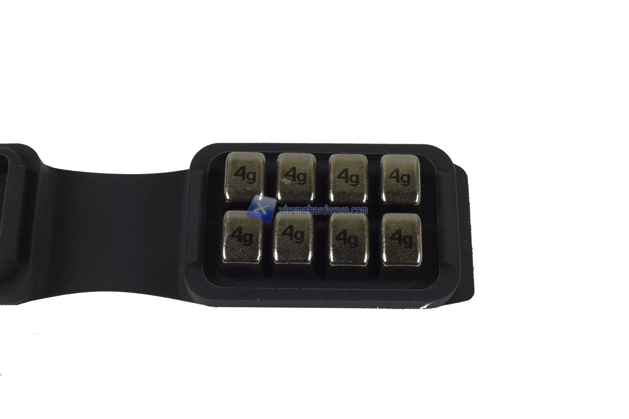 Rimuovendo inoltre uno dei due lati/supporto possiamo osservare la struttura interna che andrà ad ospitare fino a quattro pesi da 4 g ciascuno per lato. Possiamo ben vedere come siano presenti quattro fori di forma quadrato con un rivestimento in gomma per ospitare e ‘’fermare’’ i singoli pesi.