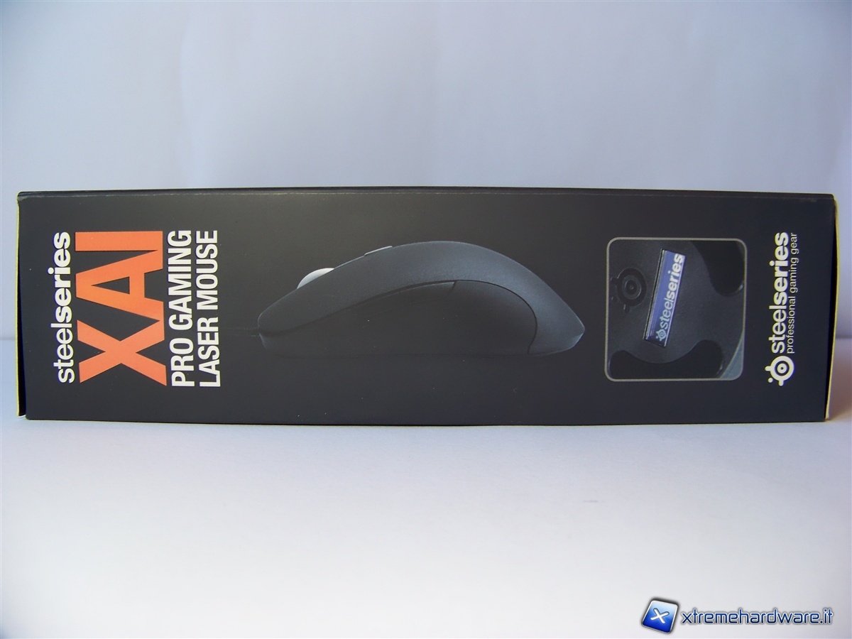 Anche la parte destra e sinistra della scatola riportano il nome del mouse e la sua immagine, affiancata da un dettaglio relativo allo schermo LCD posizionato sulla parte inferiore dello stesso.