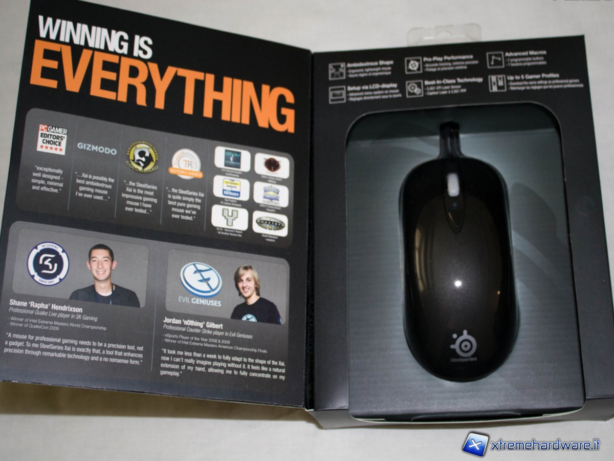 Aprendo il frontale della scatola possiamo ammirare il mouse al completo, mentre sulla metà di sinistra troviamo i commenti positivi di alcune redazioni del settore e le opinioni di due giocatori professionisti.