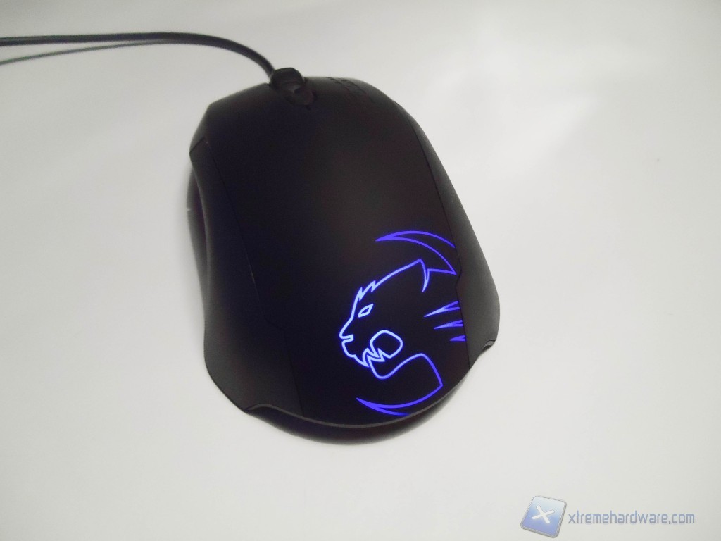 Sulla parte posteriore del mouse troviamo il logo Roccat che si illumina di una luce blu. Il sistema di illuminazione è personalizzabile su 3 livelli: fisso, pulsante e spento.
