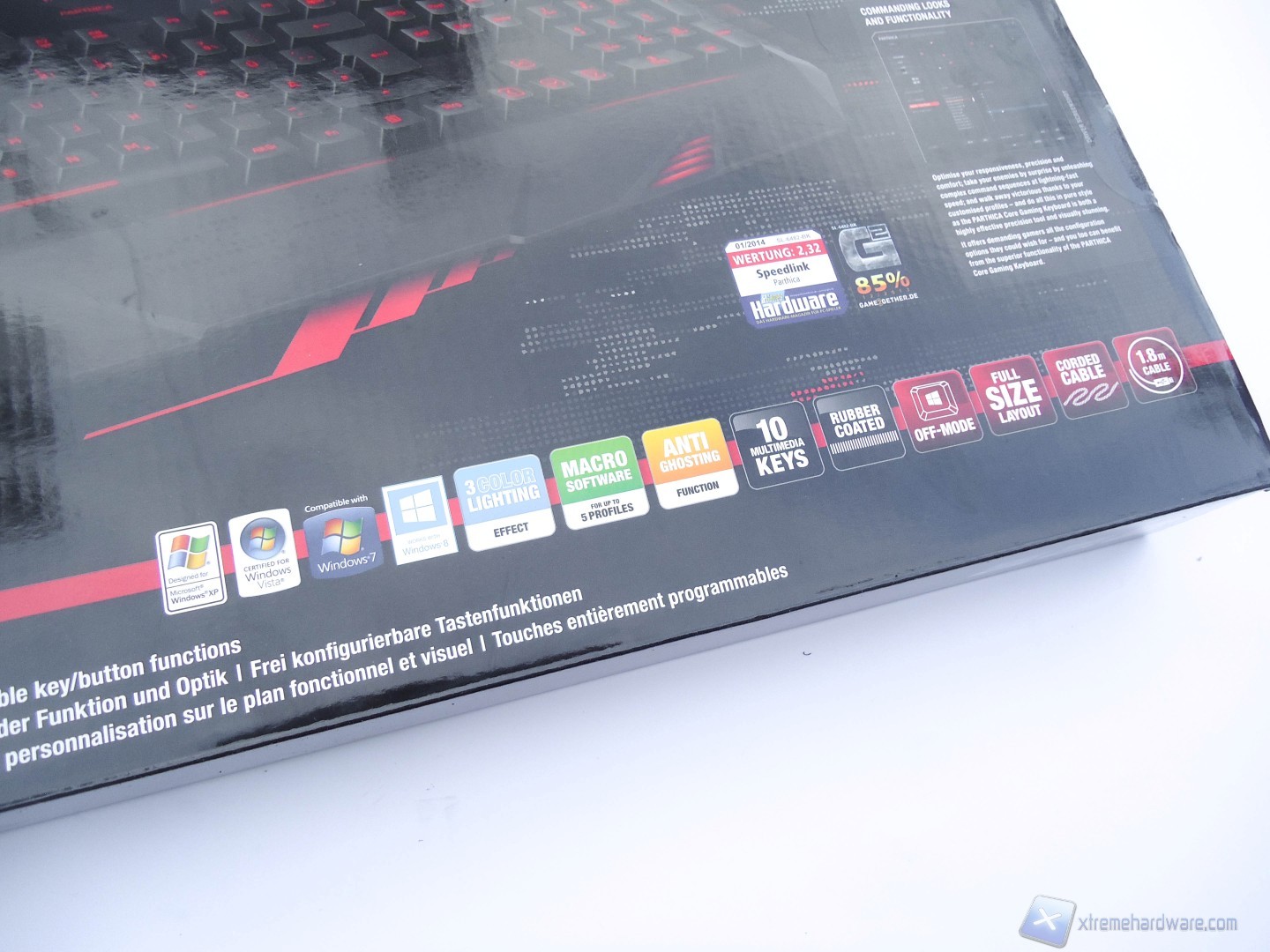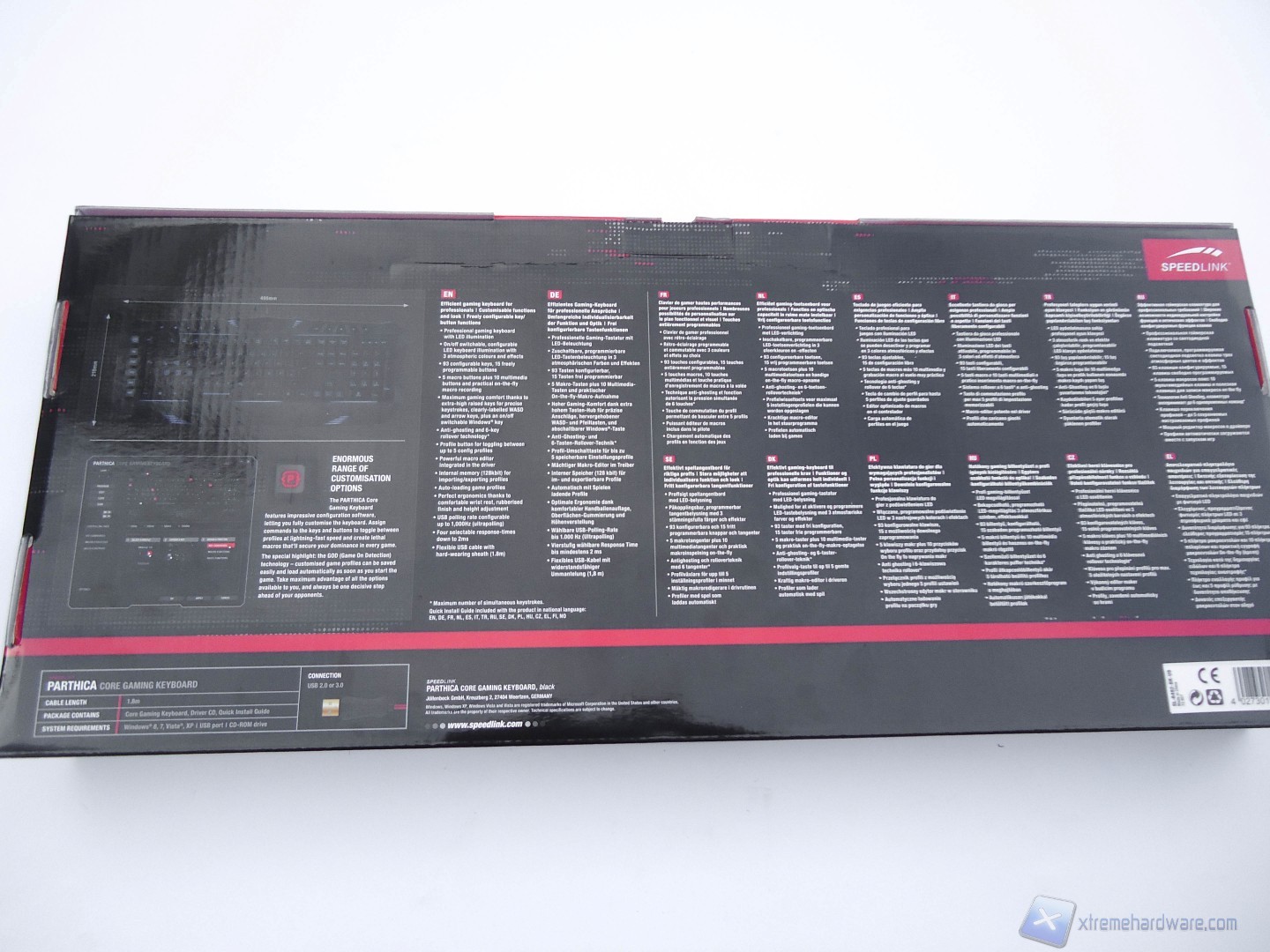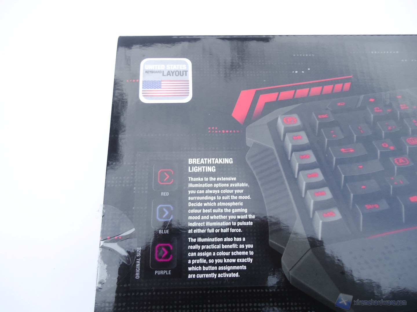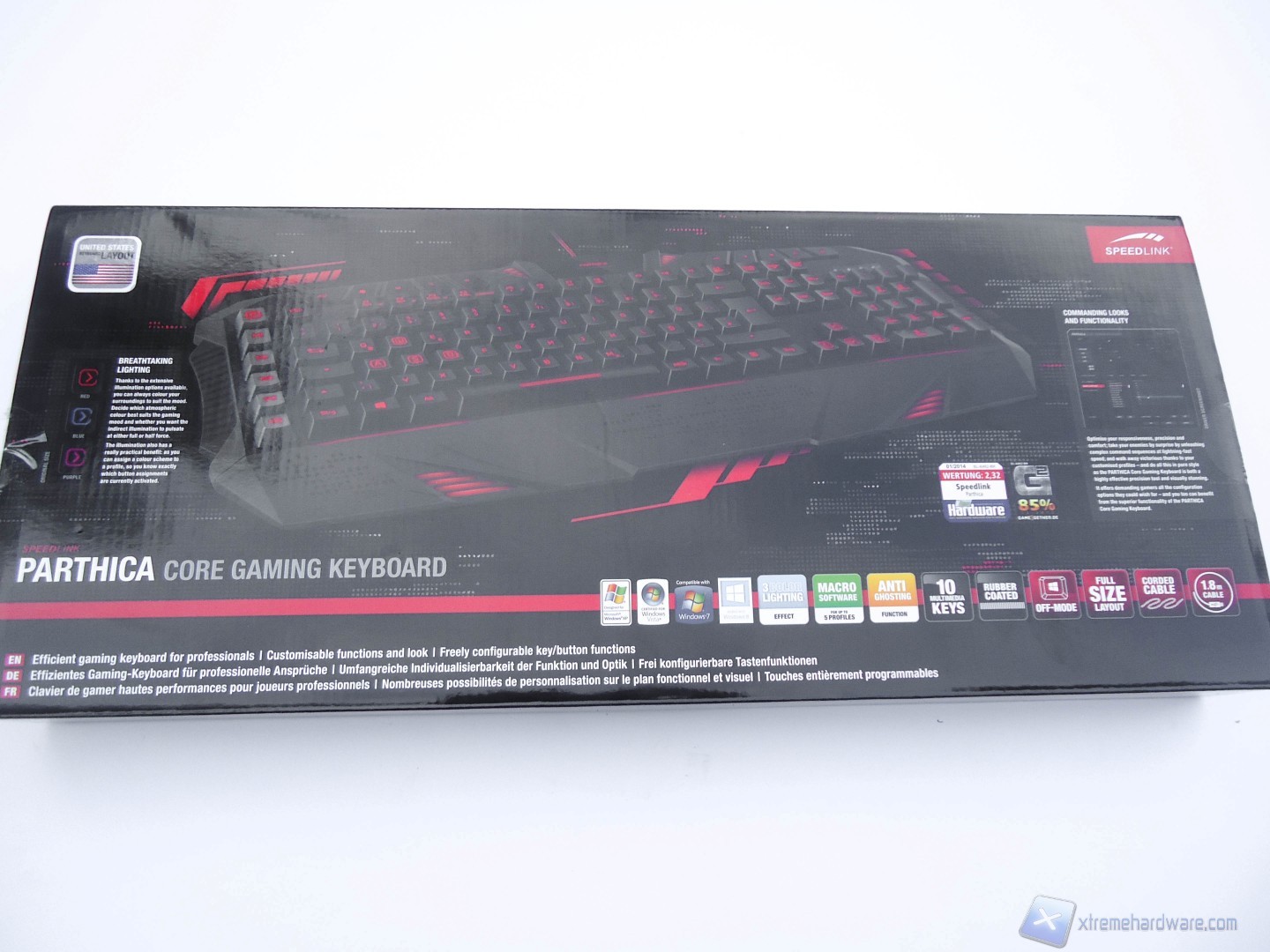 La scatola in cui è alloggiata la tastiera è di forma rettangolare e di notevoli dimensioni. Il colore della scatola è nero lucido, che fa da sfondo ad immagini e specifiche riguardanti il prodotto. Frontalmente troviamo una grande immagine della tastiera che mette in mostra anche la retroilluminazione di cui è dotata. In basso a destra troviamo le principali caratteristiche del prodotto, come ad esempio l’Anti-Ghosting e i 3 profili colore attivabili.