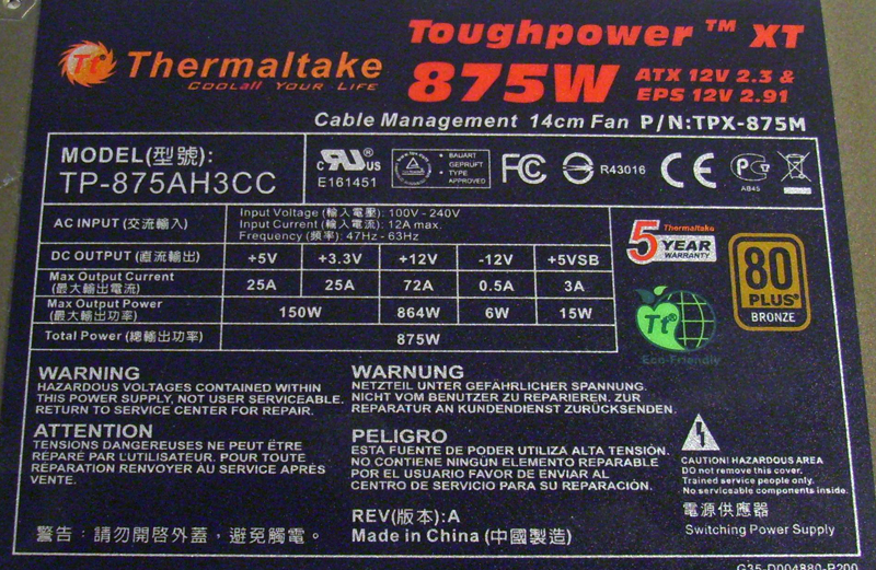 L’alimentatore si presenta con una ventola da 140mm, contro i 120mm degli alimentatori più economici, termo controllata e con velocità massima di rotazione di 1900rpm. La sigla della ventola è TT-1425B e il massimo assorbimento è 0.60A.