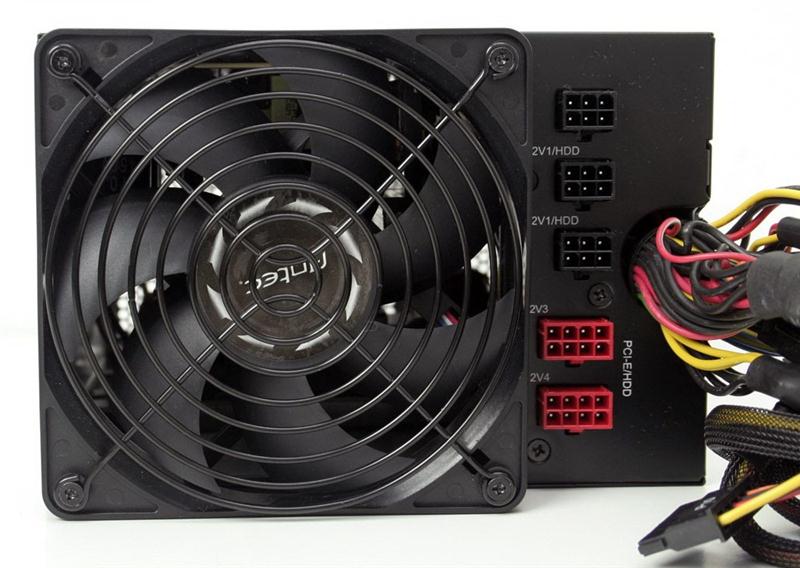 Sul retro del PSU accanto alla ventola da 120mm che serve per il raffreddamento interno ed al contempo stesso allo smaltimento del calore all'interno del cabinet, senza disturbare i flussi interni d'aria generati dalle altre ventole, notiamo i connettori per i cavi modulari, in particolare ci sono 3 connettori identificati con +12v1/HDD a cui vanno collegati i cavi modulari molex e/o Sata e due connettori identificati +12v3 e +12v4 a cui vanno connessi i cavi per alimentare le schede grafiche, oltre agli altri presenti sul corpo PSU.
