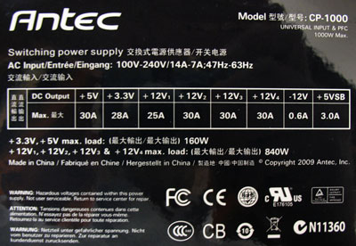 Come è possibile osservare dalle foto sopra, l'Antec CP-1000 è dotato di connessioni modulari, è possibile osservare le 4 linee da 12v di cui una da 25A e le altre tre da 30A.
