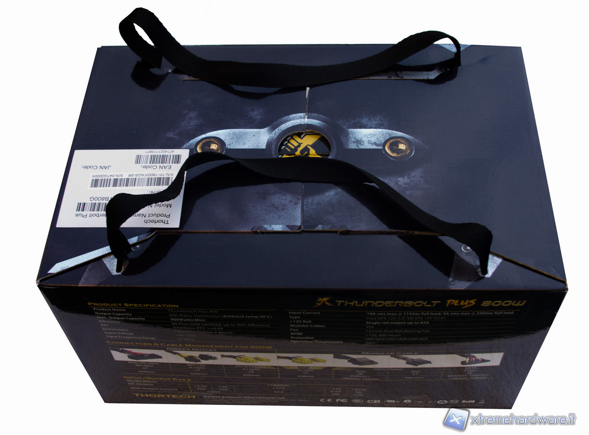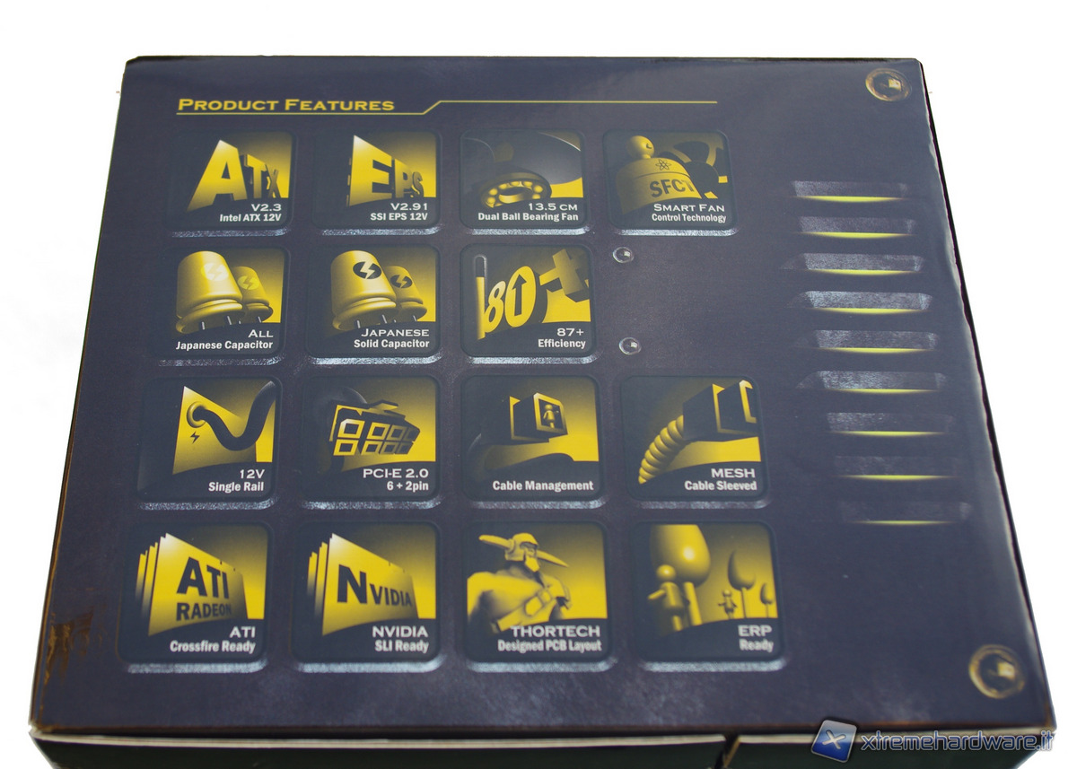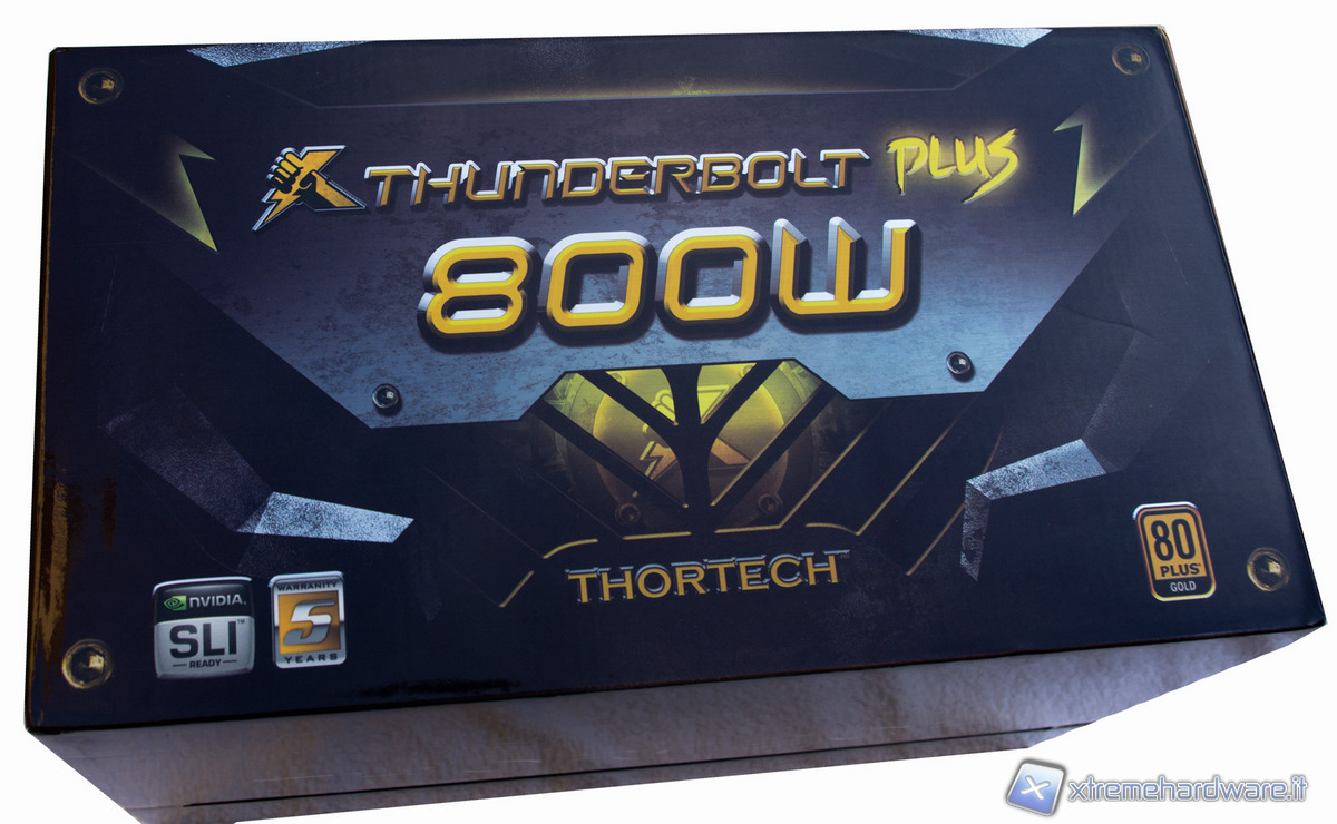 Nelle facce della scatola troviamo le indicazioni sulle caratteristiche tecniche e sulle qualifiche che il Thunderbolt ha ottenuto. In quella principale troviamo in evidenza la certificazione SLI e quella 80 Plus Gold, oltre ad un logo che ci indica i 5 anni di garanzia offerti dal produttore.