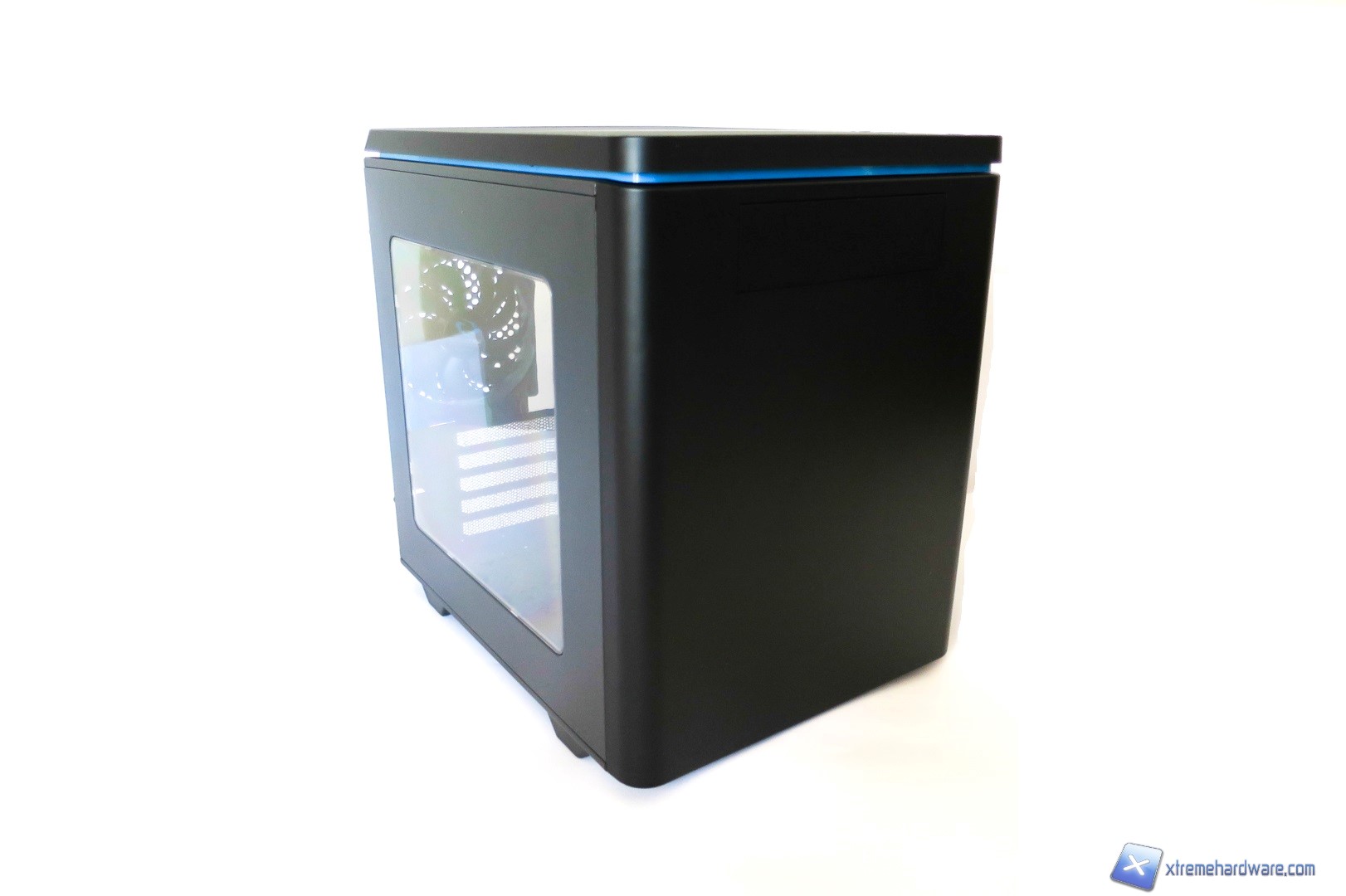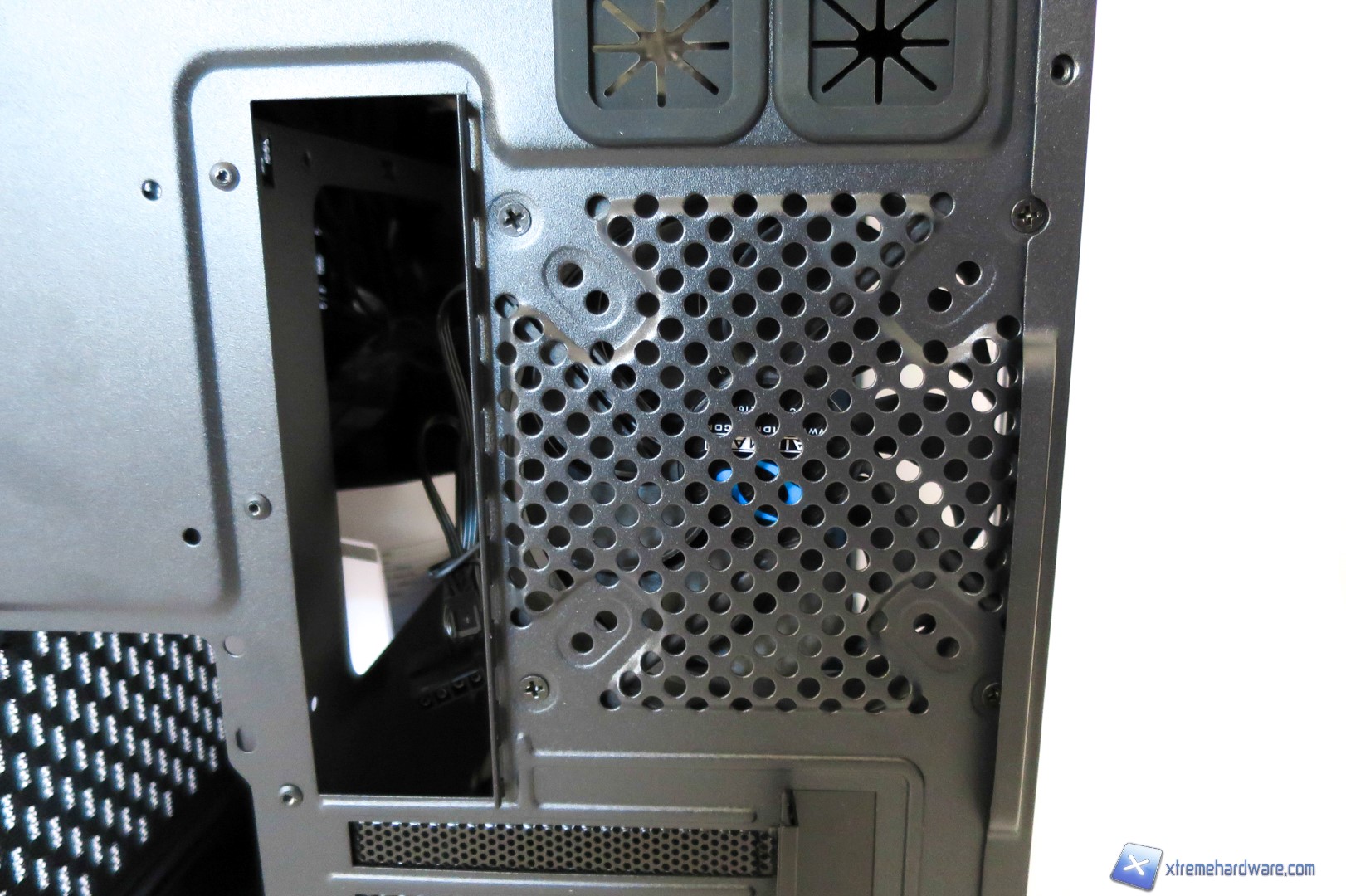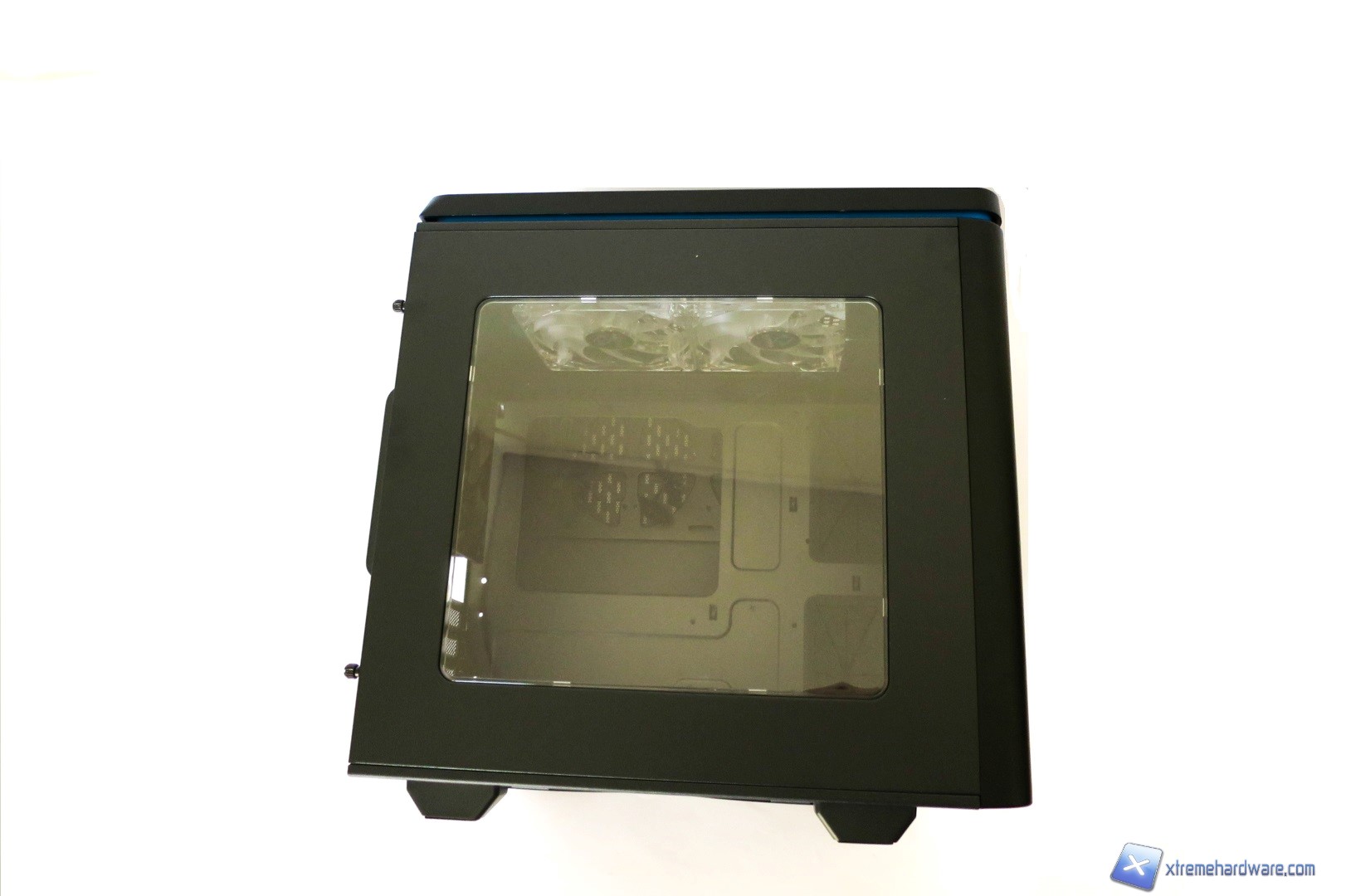 Rimuovendo la paratia in plastica possiamo vedere nel dettaglio le due ventole preinstallate da 120 millimetri con frame trasparente e LED blu che completano al meglio il design del case.