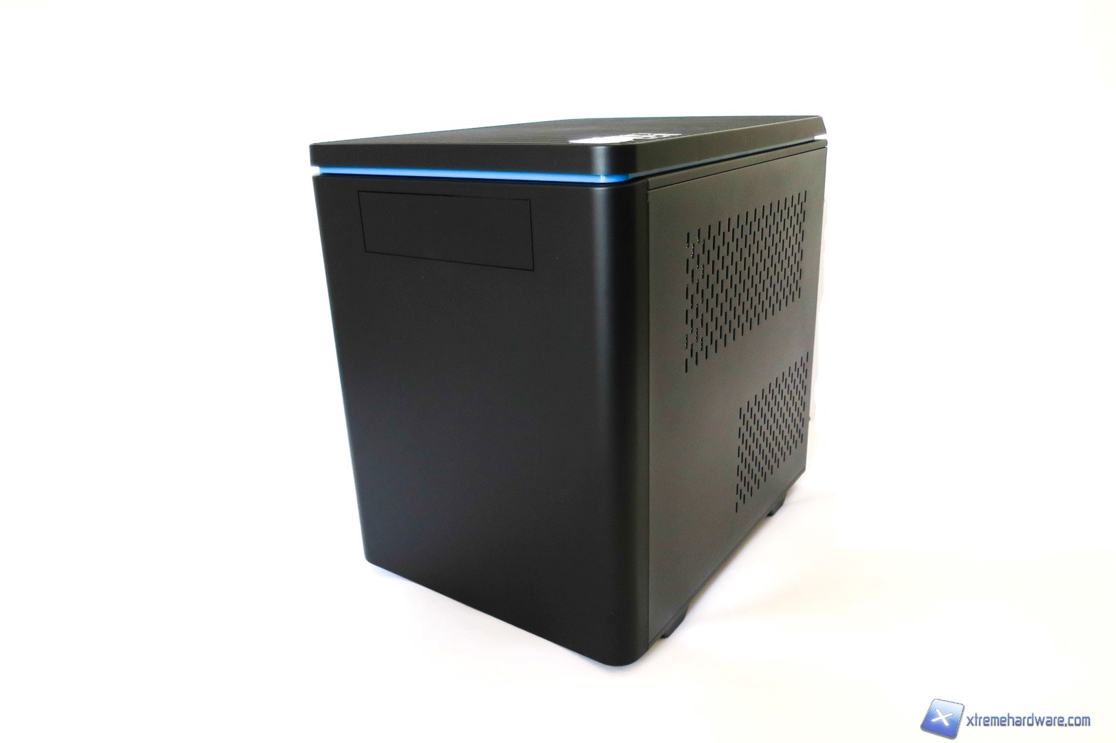 Estraendo il case dal suo imballaggio troviamo dunque un case molto curato e dalla forma cubica. Il design così come l’aspetto estetico del Raidmax Hyperion non suggeriscono nulla di nuovo perché Raidmax ha puntato, per questa volta, a linee classiche e non squadrate, come solito per i suoi prodotti. Si nota subito la forma cubica che lo pone subito come un case facilmente trasportabile ed integrabile facilmente in salotto o in spazi di ridotte dimensioni. La colorazione del nostro sample è nera, con il bordino tra il top ed il resto del case di colore azzurro, per spezzare la colorazione full black.
