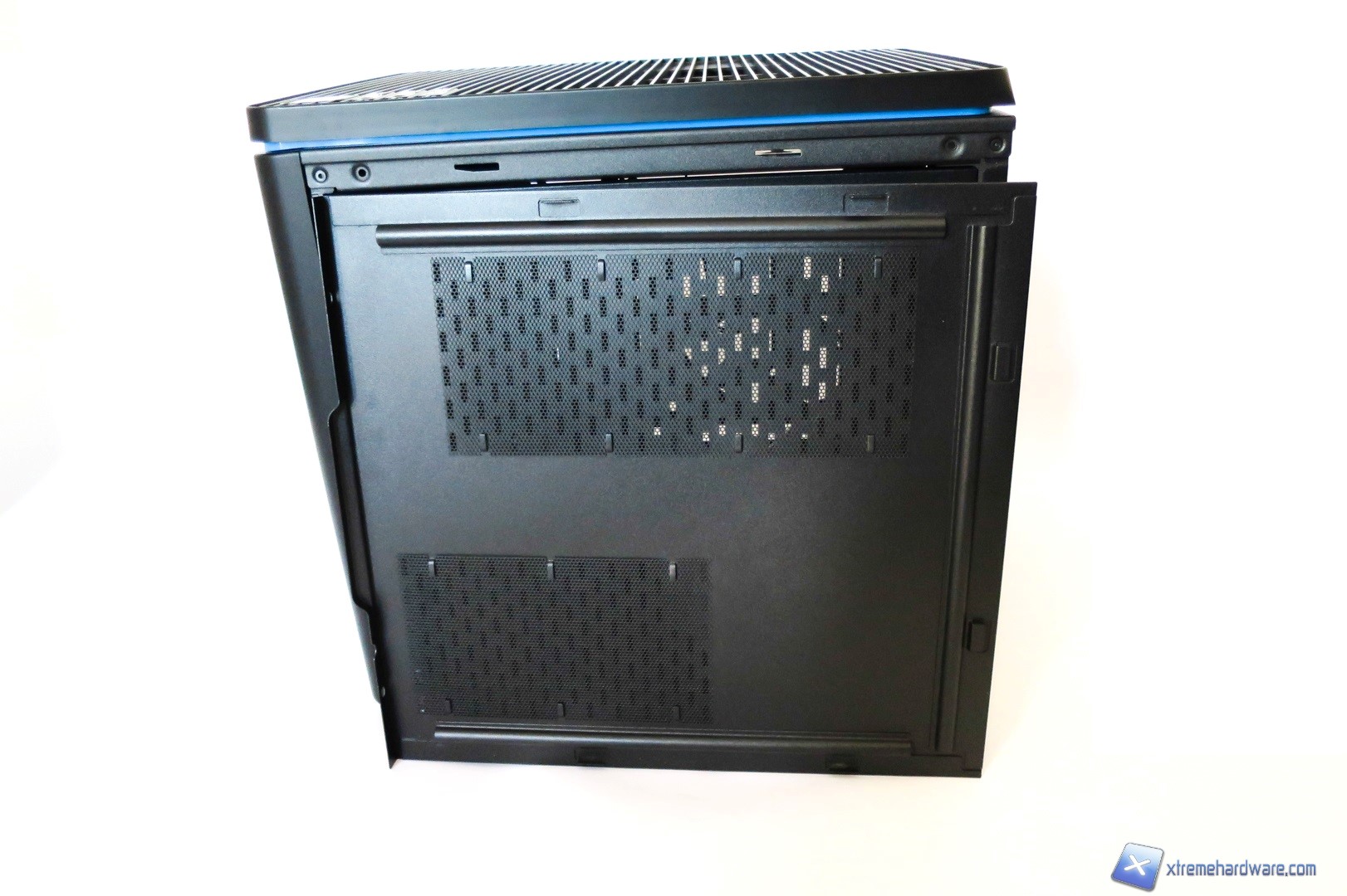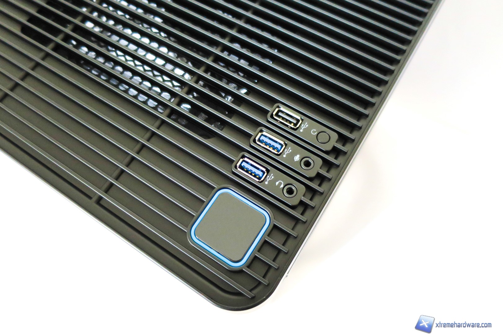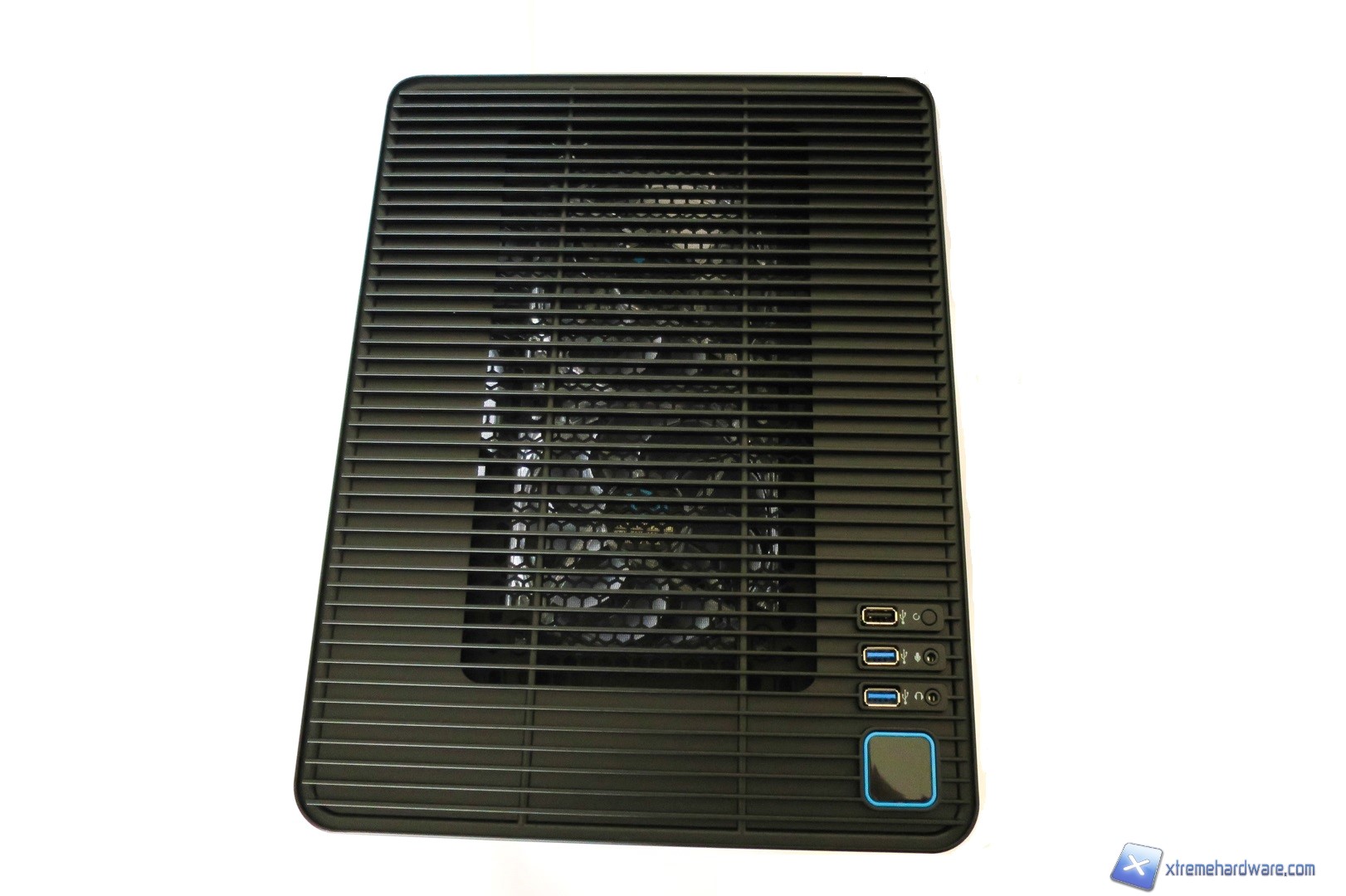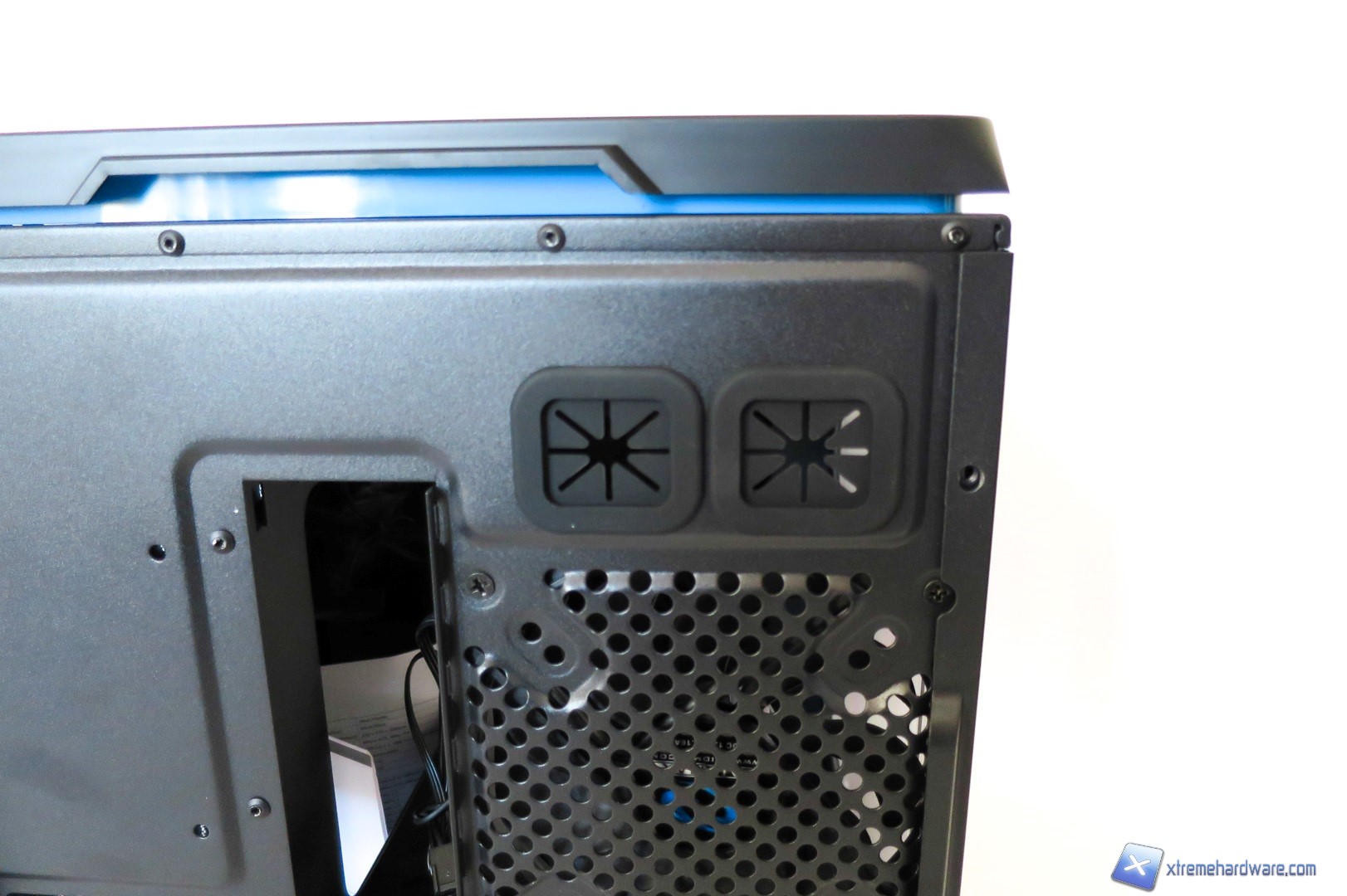 Spostandoci verso la parte superiore del case qui troviamo un pannello di plastica forato, dal quale si vedono immediatamente le due ventole con frame trasparente sottostanti, gli ingressi per le periferiche USB ed il classico pulsante di accensione. Nel dettaglio troviamo dunque una porta USB 2.0, due porte USB 3.0, il tasto di Reset, ingressi jack per microfono e cuffie ed infine il tasto di accensione di forma quadrata anch’esso contornato dal bordino azzurro che richiama il design complessivo del case.