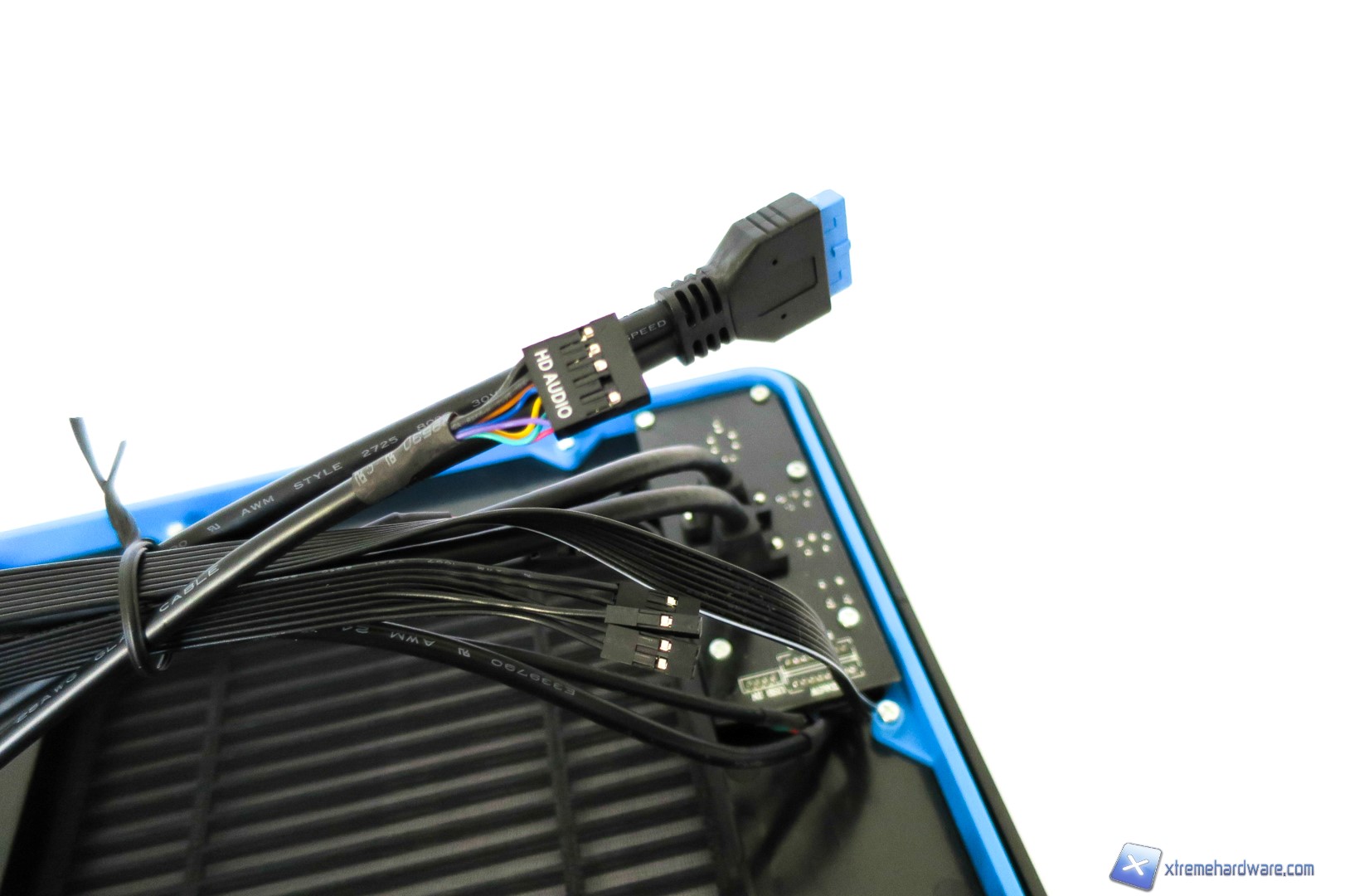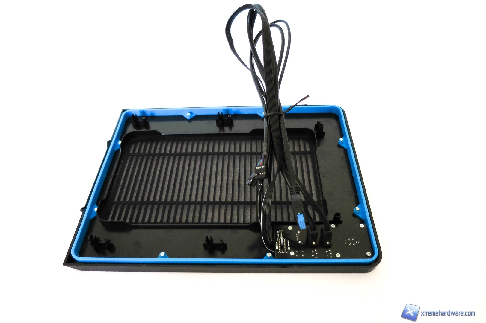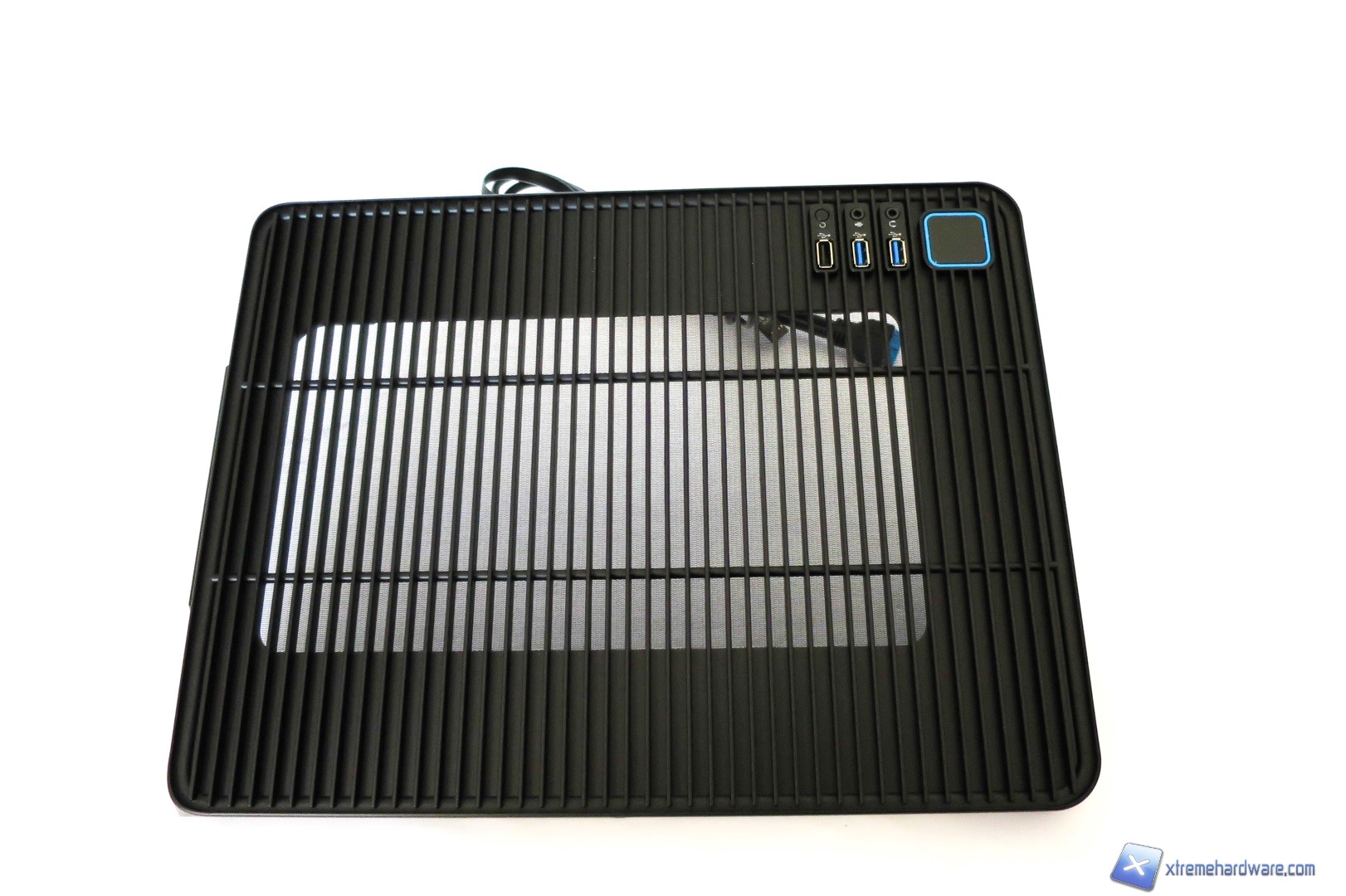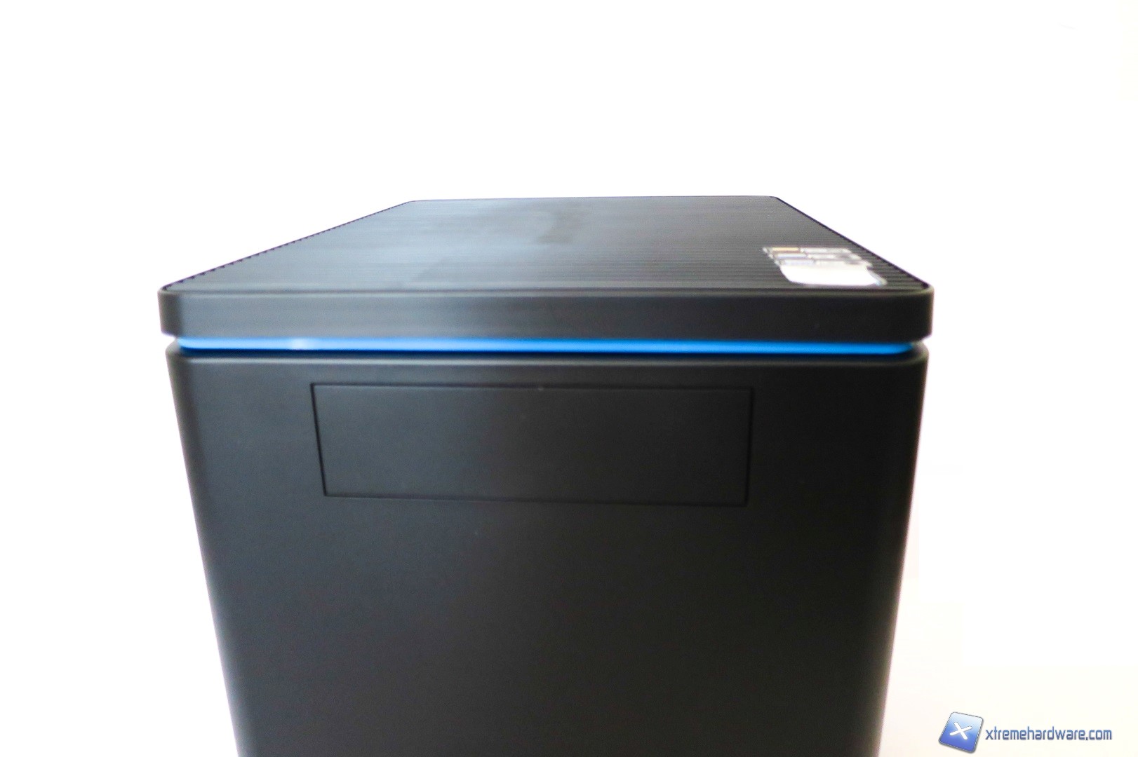 Spostandoci verso la parte superiore del case qui troviamo un pannello di plastica forato, dal quale si vedono immediatamente le due ventole con frame trasparente sottostanti, gli ingressi per le periferiche USB ed il classico pulsante di accensione. Nel dettaglio troviamo dunque una porta USB 2.0, due porte USB 3.0, il tasto di Reset, ingressi jack per microfono e cuffie ed infine il tasto di accensione di forma quadrata anch’esso contornato dal bordino azzurro che richiama il design complessivo del case.