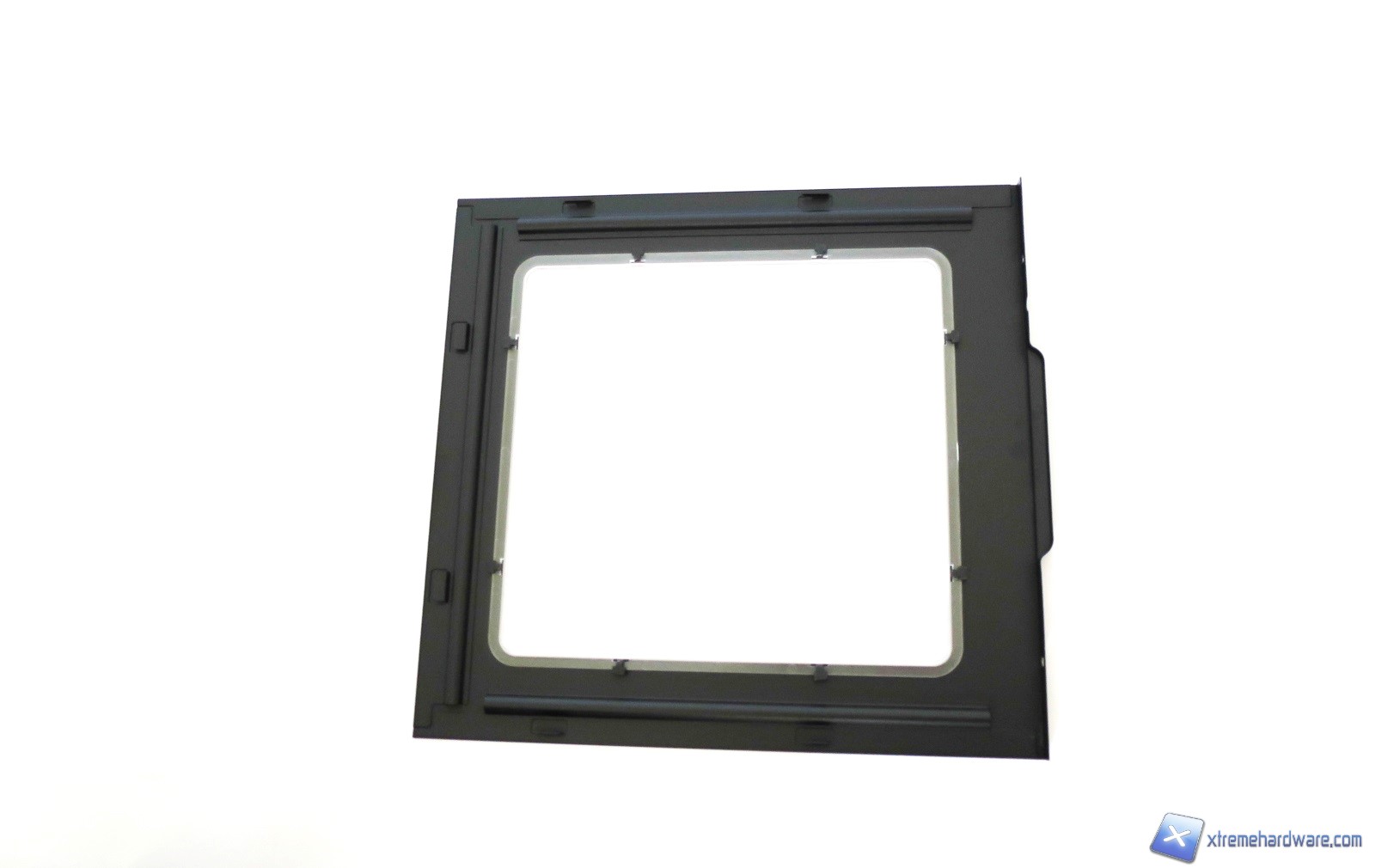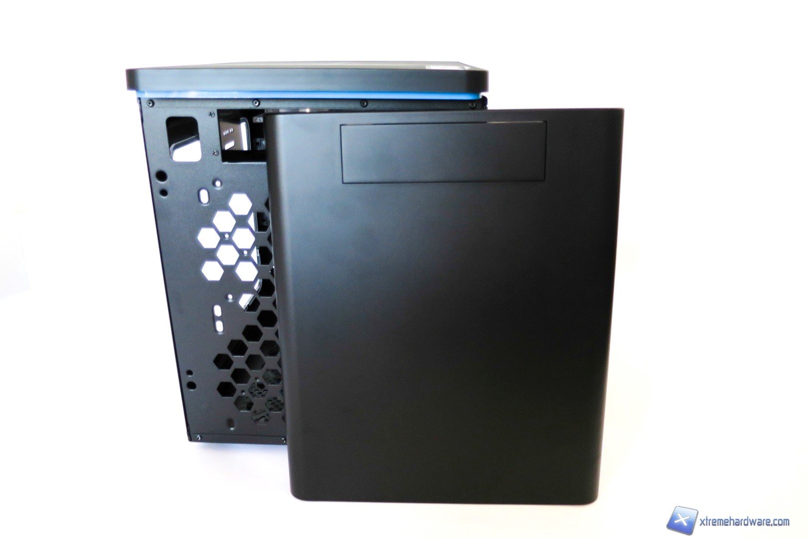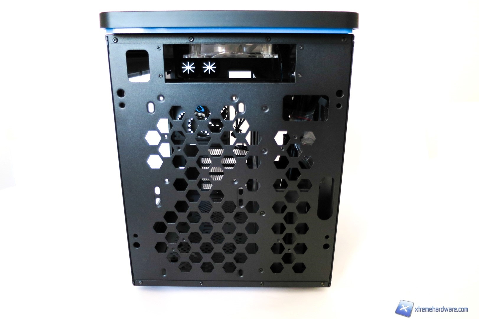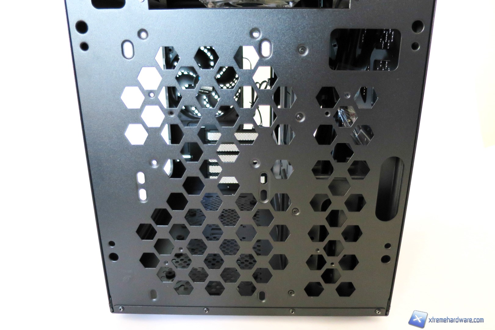 Rimuovendo la paratia frontale, possiamo accedere alla parte interna costituita dalla struttura stessa del case. Questa è dotata di ampi fori di forma esagonale che permetteranno un ricircolo d’aria, seppur minimo, dalla parte inferiore del case. Notiamo anche come siano presenti otto fori per l’installazione di ulteriori due ventole da 120 millimetri o una da 140 millimetri oltre alle tre già presenti. Questo ci permetterà di aumentare il flusso d’aria all’interno del case per ridurre le temperature. Inoltre se non possediamo una scheda video troppo lunga potremo prendere in considerazione la possibilità di installare un radiatore o un AIO nella parte frontale in modo da creare un mini impianto a liquido custom o migliorare il cable management e la disposizione dei componenti interni.