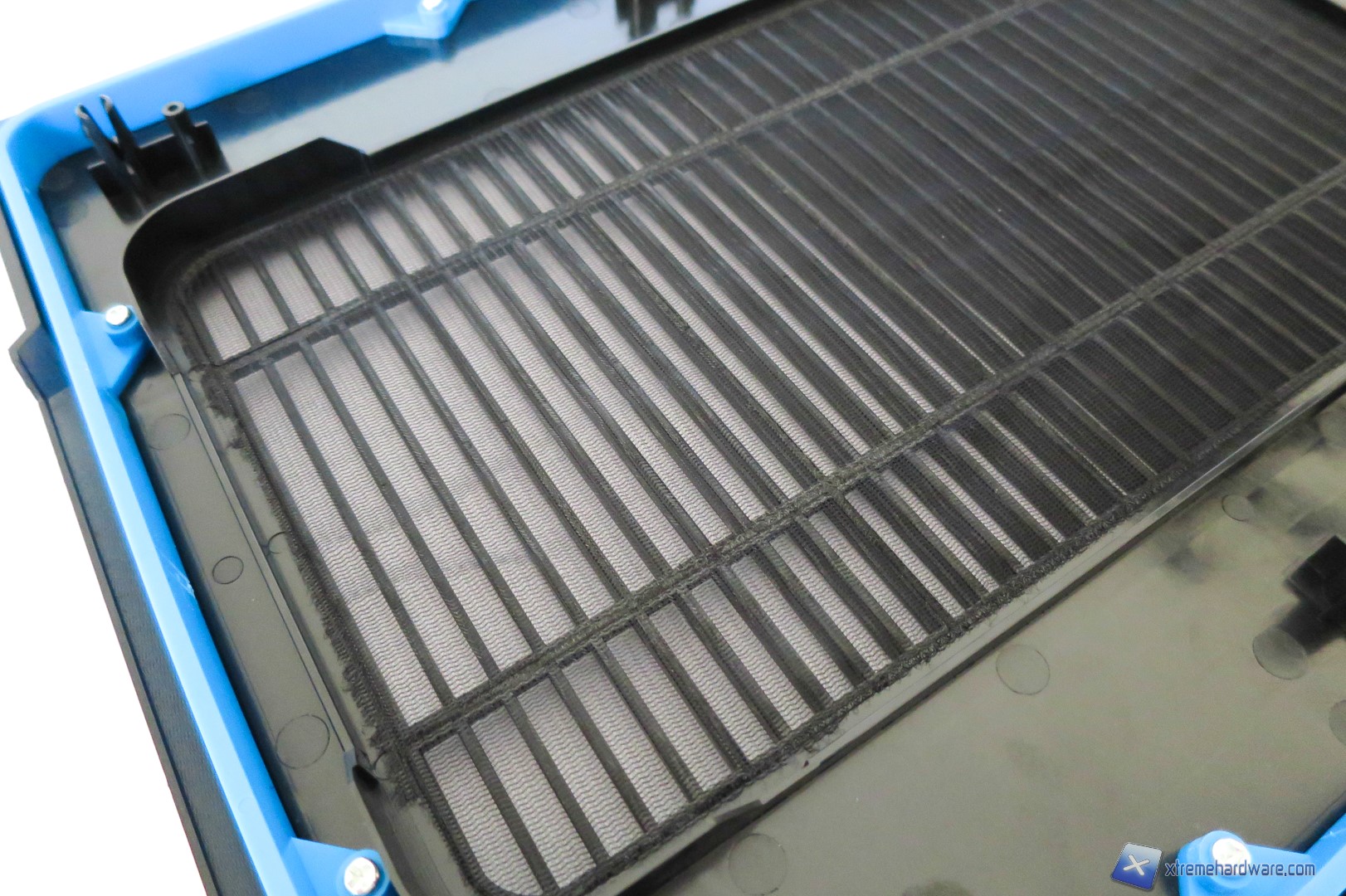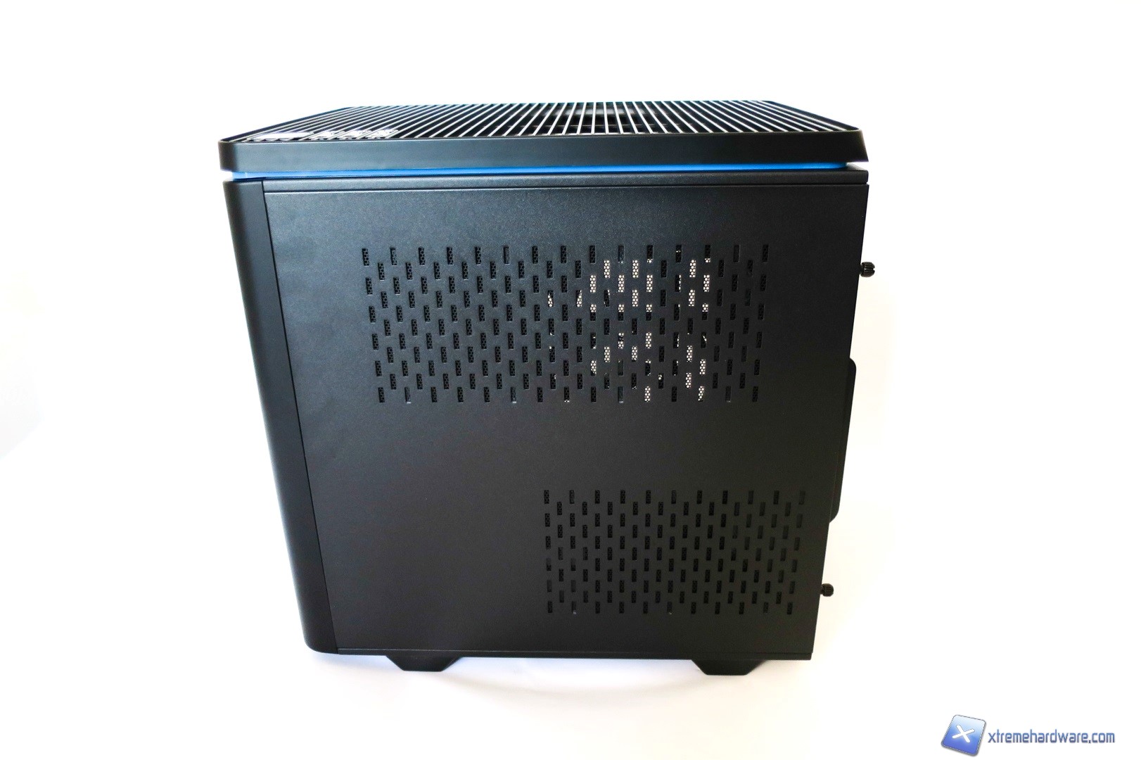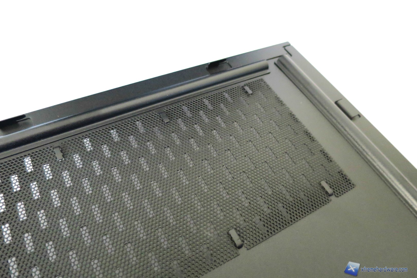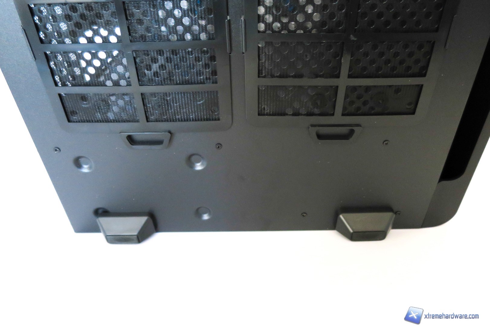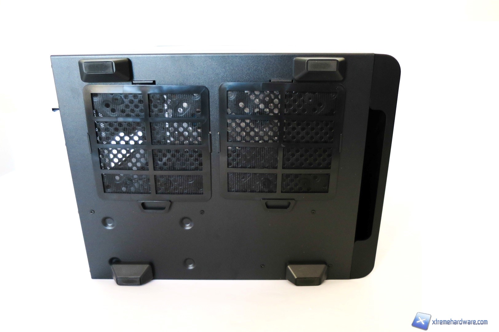 Capovolgendo il case troviamo i classici piedini con gommini antivibrazione di generose dimensioni e due filtri antipolvere removibili. Ci sono inoltre dei fori per l’installazione opzionale (interna) di due unità da 3,5 pollici quali Hard Disk o di ulteriori due ventole da 120 millimetri.