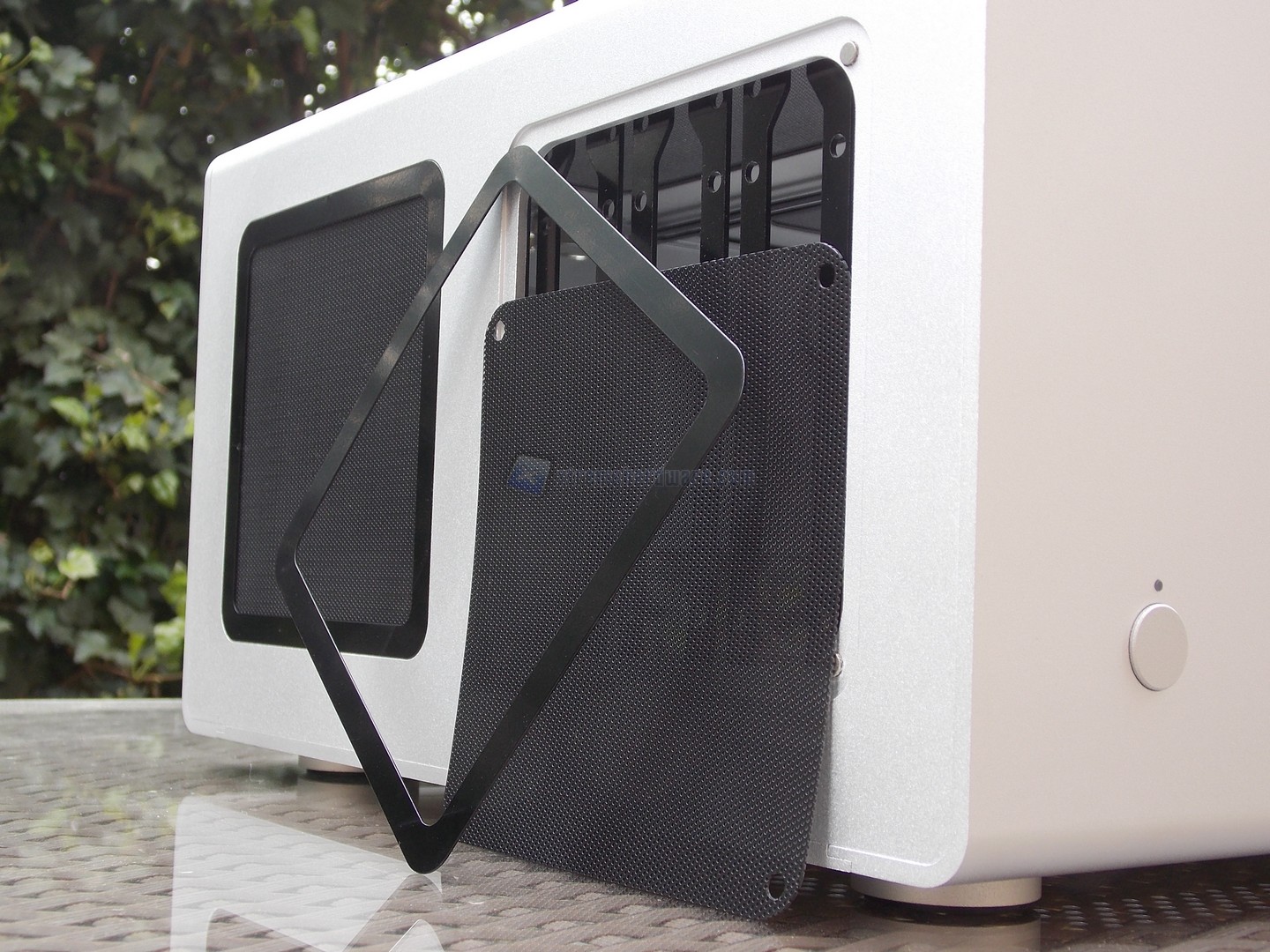 La porzione posteriore è particolarmente elementare, data la predisposizione a sinistra per un alimentatore ATX, ed una scheda madre E-ATX, che supporta quindi fino a 2 schede grafiche in parallelo. Da notare le rifiniture nel punto di inserimento della viteria.
