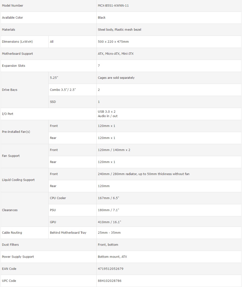 Cooler Master MasterBox 5 Window - Specifiche tecniche