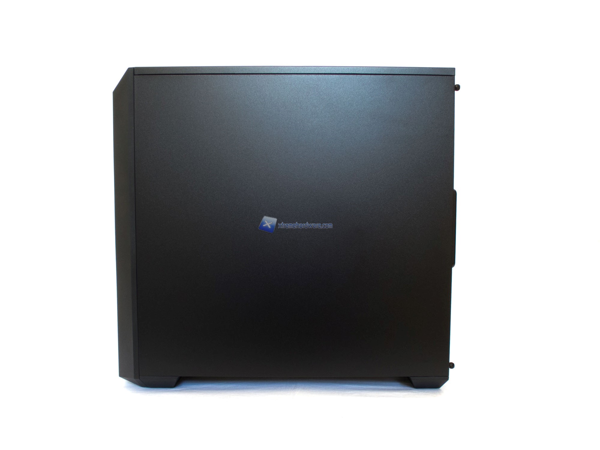 Partendo dal frontale (in plastica) il MasterBox 5 adotta sempre una griglia meshata in plastica con relativo filtro antipolvere che non solo permetterà un notevole afflusso di aria all’interno del case (grazie anche ad una ventola preinstallata da 120 mm nella zona in corrispondenza del cage per Hard Disk da 3,5’’) ma anche contrasterà alla perfezione con le superfici lisce e chiuse del resto del case. Inoltre è possibile notare come il frontale del case è l’unica zona con un design squadrato e non ‘’piatto’’ per dare maggiore volume. Presente anche l’immancabile badge/logo Cooler Master.