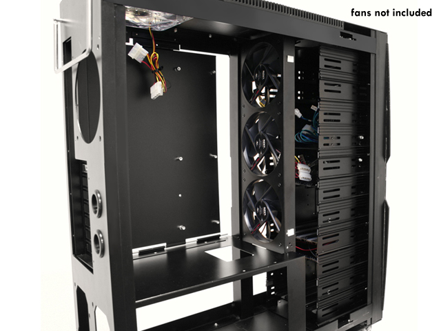Dietro agli slot per HDD troviamo una staffa con la predisposizione per tre ventole da 120mm di diametro. L'alimentatore (o gli alimentatori) sono posizionati in basso.