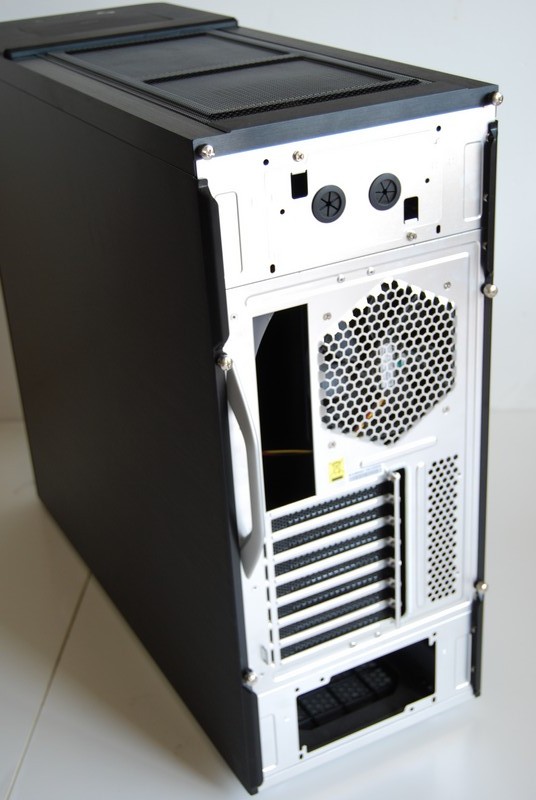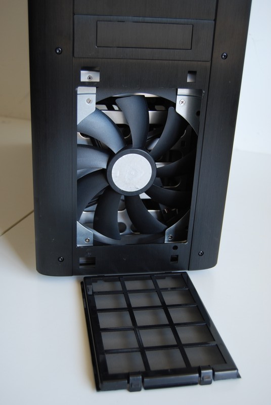 Il tetto è occupato in buona parte dalla griglia che protegge le altre due grandi ventole da 23cm. Sulla parte anteriore sono presenti i tasti di accensione e reset. Un comodissimo pannellino a scomparsa nasconde quattro prese USB, una eSata, una 1394 (Firewire) e i jack per microfono e cuffie.