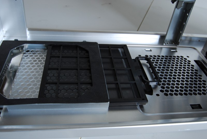 Sia sopra che sotto al piatto estraibile lo spazio è molto abbondante. Il case è infatti predisposto per installare l'alimentatore in basso o in alto. Sono presenti infatti due pannelli, uno da usare come mascherina a cui avvitare l'alimentatore e l'altro da usare come copertura e predisposto per il passaggio dei tubi dell'impianto a liquido. Originariamente si trovano il primo in basso e il secondo e in alto ma le rispettive posizioni possono essere scambiate semplicemente svitandole 4 viti con cui sono fissati al resto del case.