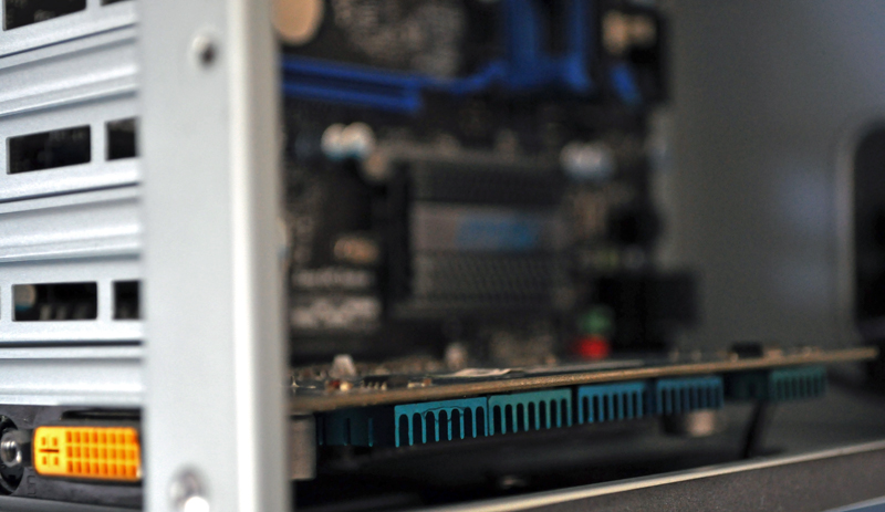 Come scheda video infine usiamo una Zotac GeForce FX5200 passiva, a cui abbiamo aggiunto dei dissipatori sulle memorie. Notare come lo spazio fra scheda video e case è piuttosto esiguo: 1.5cm circa dal dissipatore e 2.5cm dalla scheda. Utilizzare l’ultimo slot pci in questo caso può essere piuttosto difficoltoso.