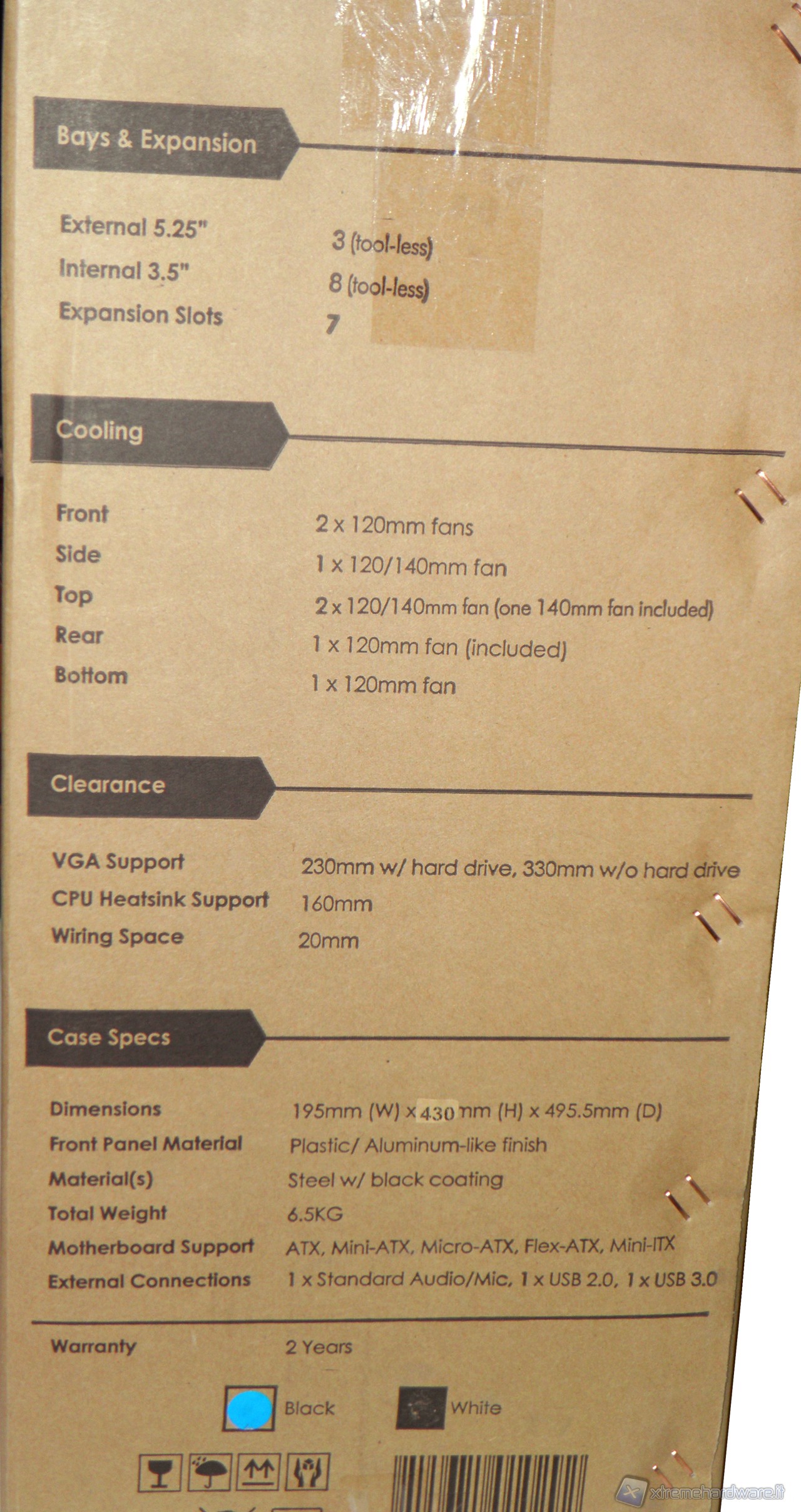 Viene evidenziata la presenza di un connettore frontale USB di tipo 3.0, la possibilità di effettuare un cable management dietro la scheda madre, l'attenzione al raffreddamento del case con gli alloggi delle varie ventole, la sede dell'alimentatore nella parte inferiore del case (come avviene tipicamente nei modelli più ricercati) e la presenza di slot 3.5'' e 5.25'' tool-less.