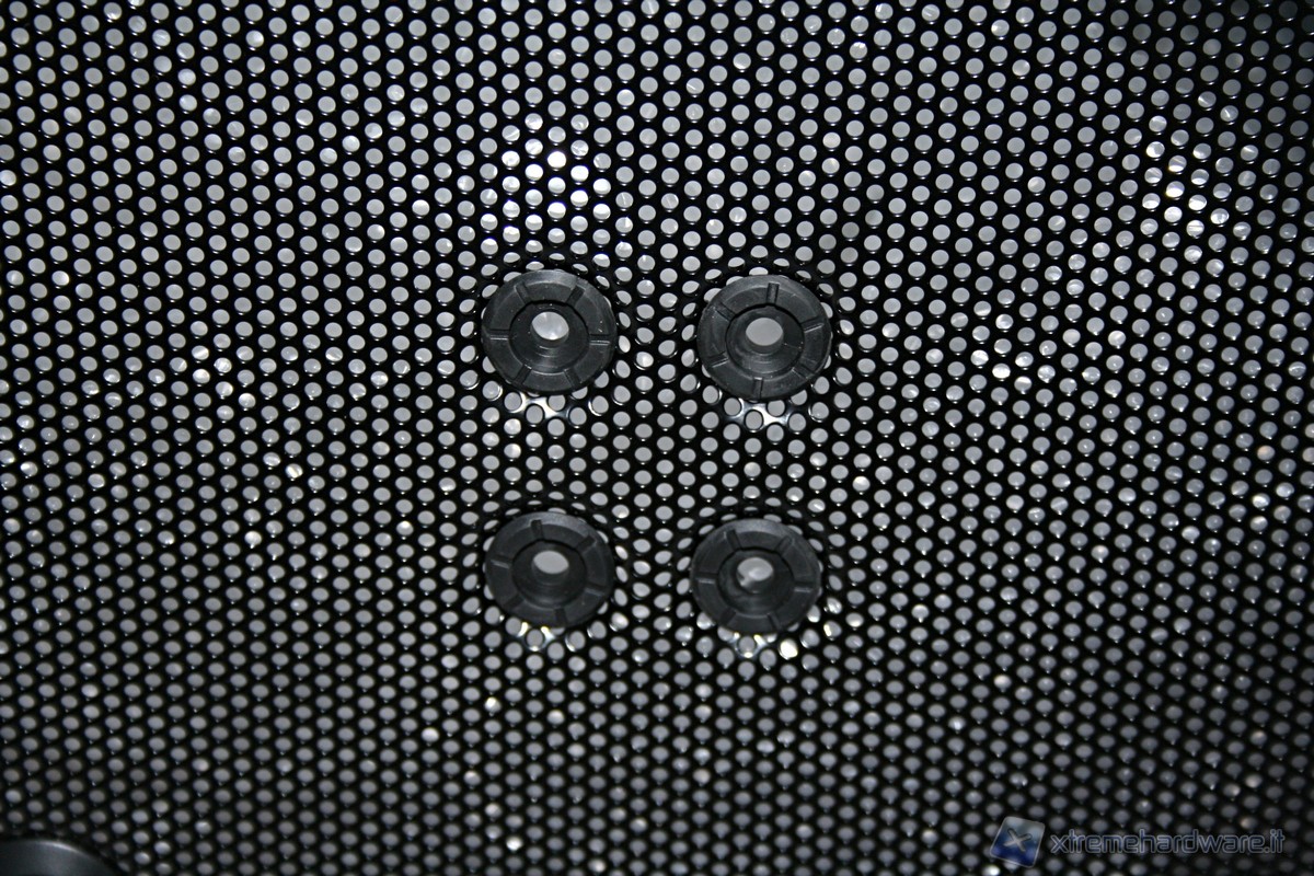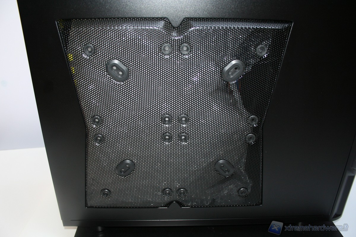 Nel lato sinistro è presente la paratia perforata dove sarà possibile alloggiare ben 4 ventole da 120mm oppure una singola da 140mm in posizione centrale, alternativamente una 180mm oppure persino una 230mm. Ottime le rifiniture come l’estetica complessiva, a dimostrazione di questo notiamo persino la presenza di profili gommati antivibrazioni per ogni singola ventola. Nella parte superiore poi troviamo ben tre griglie in grado di fornire ventilazione addizionale. Nella parte destra invece troviamo solamente il logo della serie Venom molto ingrandito, d’effetto e curato esteticamente. Le paratie vengono rimosse tramite delle classiche e grandi viti, svitabili a mano, di colore nero, che ben si intonano con la colorazione del case.