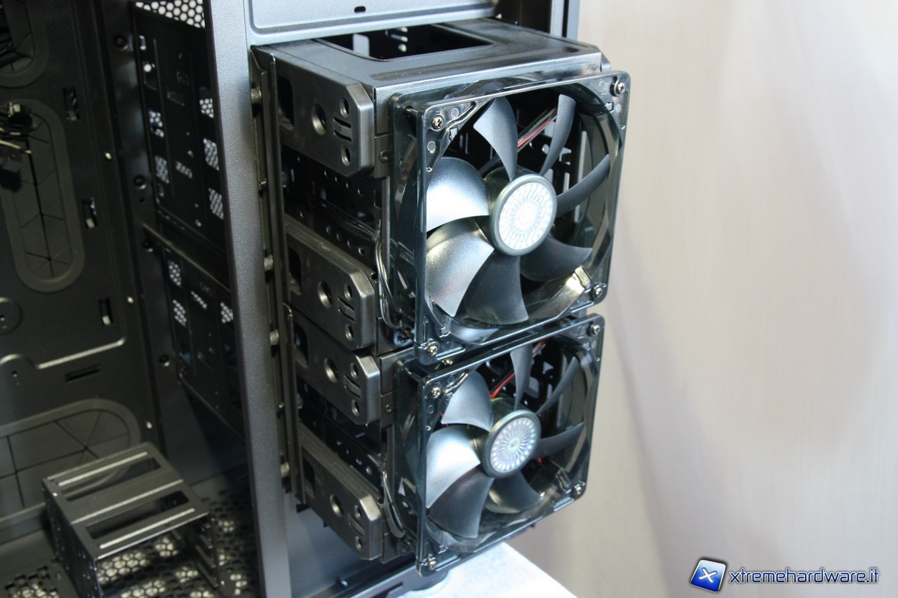 Notiamo anche le ventole adibite al raffreddamento degli hard drive, che troveremo installate dietro al pannello laterale sinistro in modo tale da creare un flusso d'aria omogeneo per smaltire direttamente il calore generato dalle periferiche di memorizzazione, senza influire sul resto del PC.