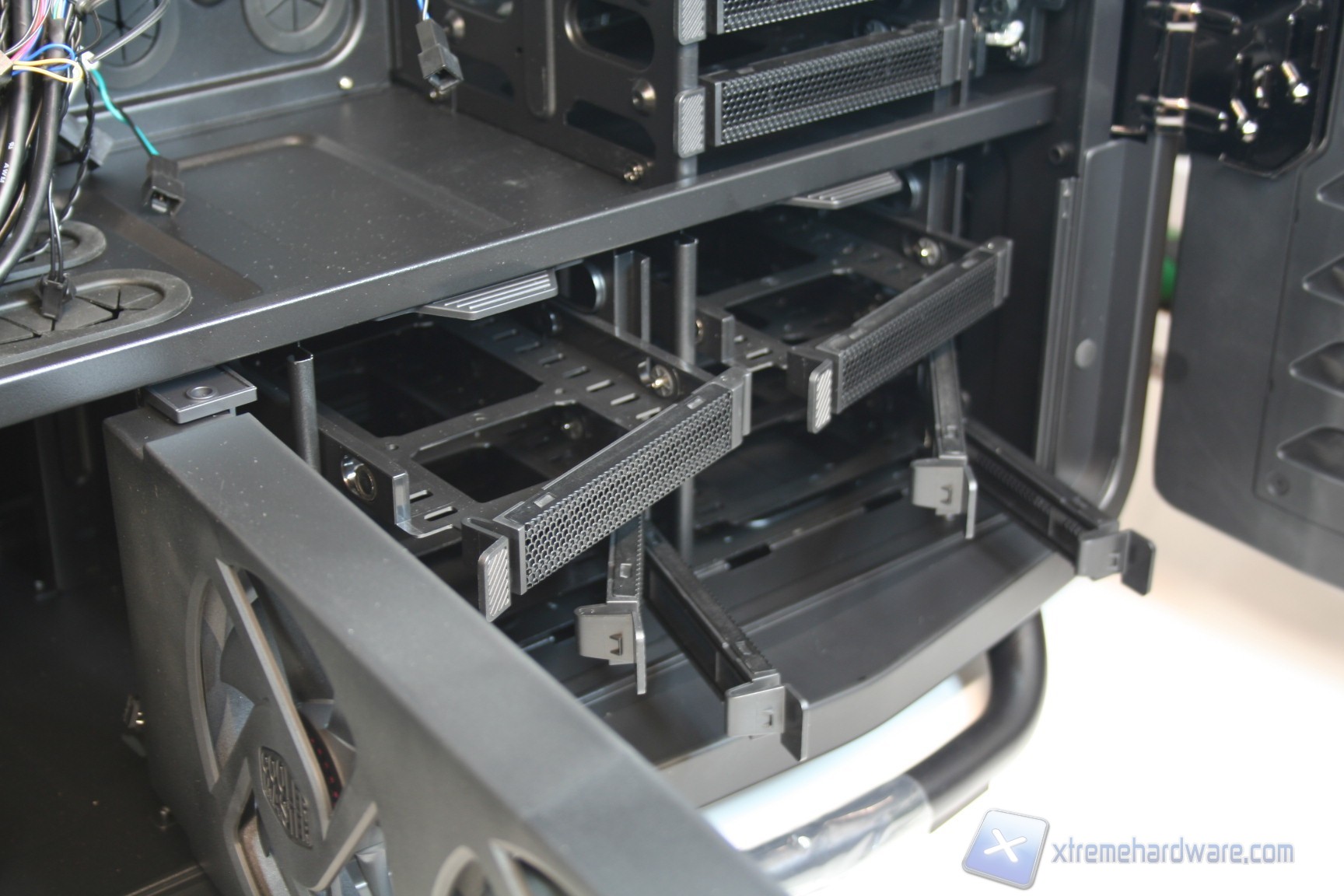 La gestione dei dischi rigidi è esemplare. Siamo dinanzi ad una soluzione incentrata su cage removibili, di tripla tipologia e totalmente ventilati da ventole di diverso diametro, eccetto quelli hot swap frontali. Il cage situato dinanzi alla ventola anteriore da 200mm permette l’installazione di 5 hard disk da 3.5”, ed altrettanti SSD da 2.5”, tramite un classico meccanismo a scorrimento e blocco orizzontale; sono presenti dei perni di bloccaggio dotati di disaccoppianti in gomma, quindi non ci sarà nessun problema per eventuali vibrazioni. Nulla è lasciato al caso! Ai fini del modding sarà possibile staccare agevolmente questo cage, tramite la rimozione di viti.