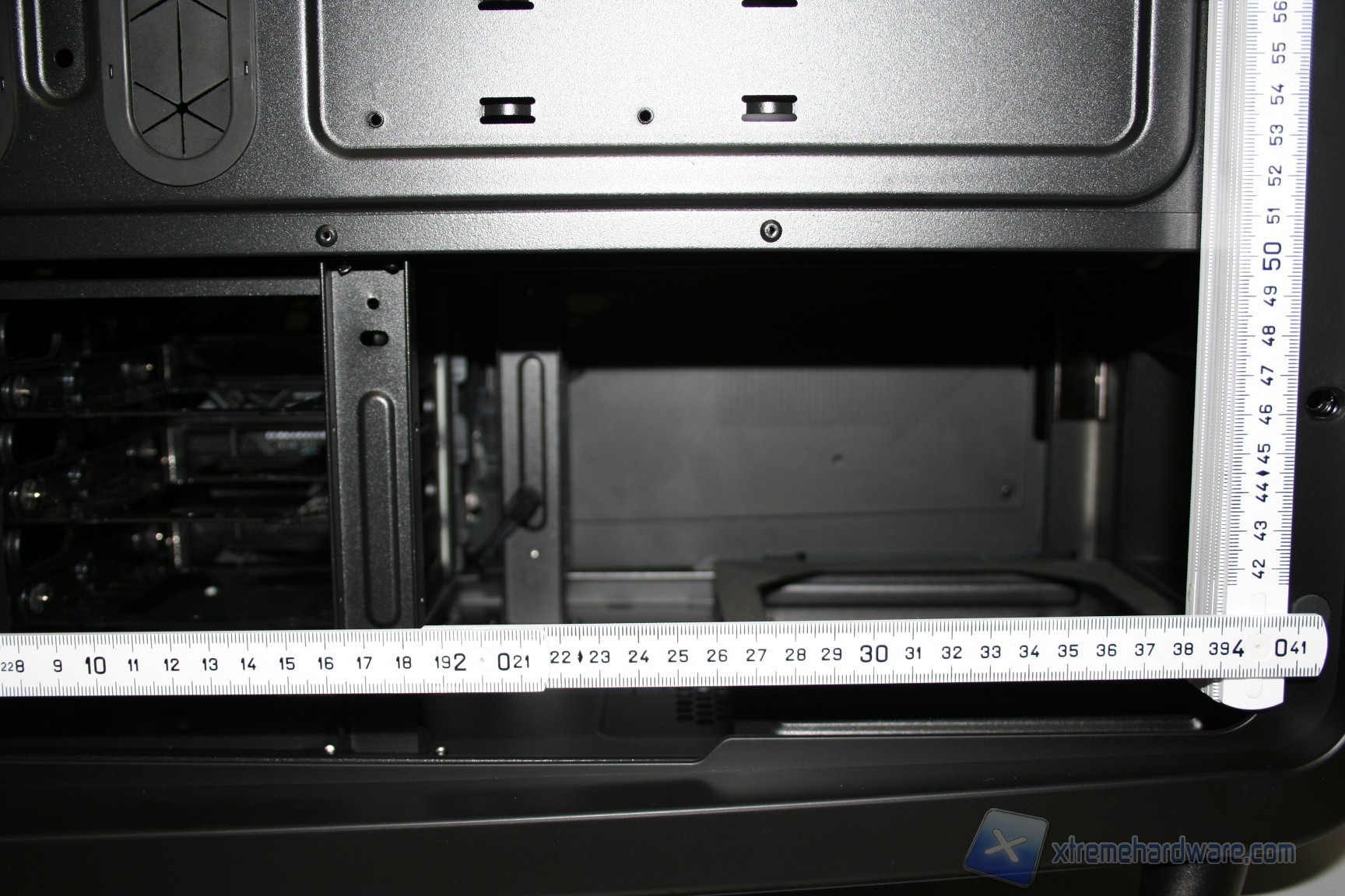 Il piatto della scheda madre è interamente in acciaio e diversamente da alcuni modelli di cabinet top di gamma degli anni passati non è removibile. La qualità, la robustezza e lo spessore sono tanto evidenti quanto di livello e sono presenti 8 guaine in gomma antitaglio, la cui stabilità risulta essere davvero elevata, e quindi non ci sarà nessuna fuoriuscita delle stesse, dagli incavi, all’atto del passaggio dei cavi. Nella parte superiore sono presenti due grandi aperture per il passaggio dei cavi, molto pratiche per via della dimensione, ed oltre a questo ovviamente è presente l’apertura del piatto della scheda madre. Abbiamo apprezzato in particolar modo la grandezza del foro, nella parte superiore sinistra, dove sarà possibile far passare il connettore di alimentazione ausiliario della scheda madre da 4/8pin, in quanto non ci sarà nessun problema all’atto del ripiegamento dello stesso, per inserirlo nel corrispettivo connettore di alimentazione della scheda madre. La fessura d’installazione per il backplate posteriore è decisamente grande e permetterà tranquillamente il montaggio di dissipatori particolarmente complessi. Lo spazio tra la scheda madre e la ventola superiore da 200mm è leggermente superiore allo standard ma notifichiamo che questa ventola, o ventole alternative, sarà possibile posizionarle sopra alla paratia di acciaio di bloccaggio, aumentando quindi lo spazio in questo settore. Questo implica che la procedura di assemblaggio sarà facilitata, che non ci sarà nessun problema durante il montaggio di dissipatori particolarmente grandi oppure di un radiatore da 240mm ad elevato spessore nella parte superiore. Posteriormente si hanno ben dieci aperture dove inserire fascette restringenti, il che permette un livello di pulizia e di ordine elevatissimo. Oltre a ciò, sarà possibile montare un radiatore da 240mm in posizione superiore, oppure un radiatore da 120/140mm con spessore doppio nella parte posteriore, al posto della ventola preinstallata. Affronteremo meglio le possibilità di integrazione a liquido in un capitolo separato.