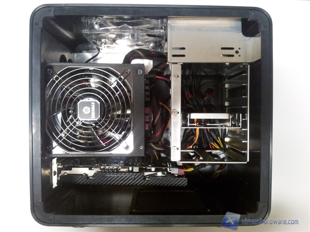 La seconda idea riguarda le ventole: utilizzando una ventola da 120mm nella parte superiore del case, invece che di 140mm, molti utenti avrebbero potuto montare, senza modifiche o senza comprare adattatori, un sistema a liquido all-in-one per la CPU in quanto i radiatori di tali sistemi sono da 120mm. Non solo, il minor spazio a disposizione dovuto alla ventola da 120mm poteva permettere addirittura l’installazione di ben due ventole da 120mm, permettendo quindi, salvo installazione di un lettore DVD, di inserire addirittura un sistema a liquido all-in-one biventola sul top del case.