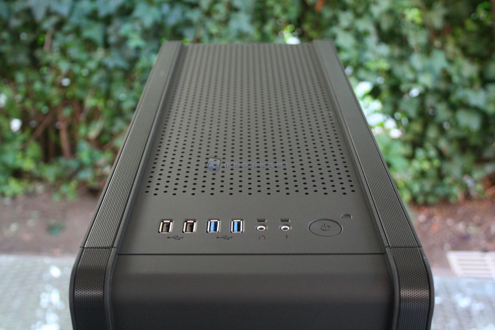 Nella parte superiore troviamo gli ingressi USB, inseriti direttamente nel secondo pannello anti-impronta. Sono presenti 2x3.0, 2x2.0 audio, mike, accensione e reset. Come si evince dalle foto, la lavorazione degli spigoli è particolare in quanto sono presenti due bande in mesh che partono dalla porzione anteriore e terminano alla fine di quella superiore. Nella parte superiore ovviamente sono presenti le medesime aperture forate precedenti.