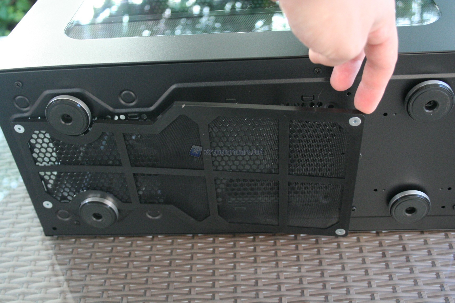 Anche qui la configurazione è classica, ma è presente un comodo filtro antipolvere con magneti, il che facilita molto le operazioni di pulizia. Non è possibile montare rotelle perché i piedi di supporto sono fissati con una vite. L’altezza da terra però è mediocre. C’è il supporto per una ventola accessoria da 120mm nella base. I quattro supporti sono di altezza standard, quindi il pescaggio di aria dal basso sarà nella norma e quindi sconsigliamo di posizionare il cabinet su una moquette o un tappeto.