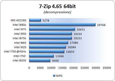 7-Zip integra un benchmark interno con il quale è possibile selezionare il numero di threads da eseguire in parallelo a seconda della tipologia di processore utilizzato. Riporta i risultati in MIPS dei test di compressione e decompressione.