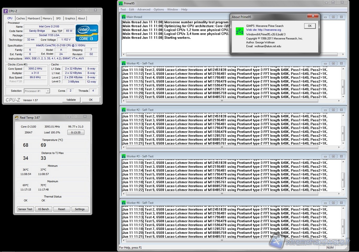 Passiamo adesso all'analisi delle temperature rilevate sulla cpu sia in stato di riposo (idle) sia in stato di massimo carico operativo (full load). A tal proposito abbiamo usato per mettere sotto stress la cpu usata, che nel nostro caso è il modello dual core Sandy Bridge Core i3-2100, l'ottimo software di stress test Prime95 vers. 26.6, aggiornato all'ultima versione che nella modalità blend ci permette di sostenere un carico decisamente elevato. Inoltre l'ultima versione di questo software è particolarmente pesante, una situazione che ben difficilmente si ripeterà in uso quotidiano. Le letture delle temperature vengono fatte tramite il software Real Temp vers. 3.67