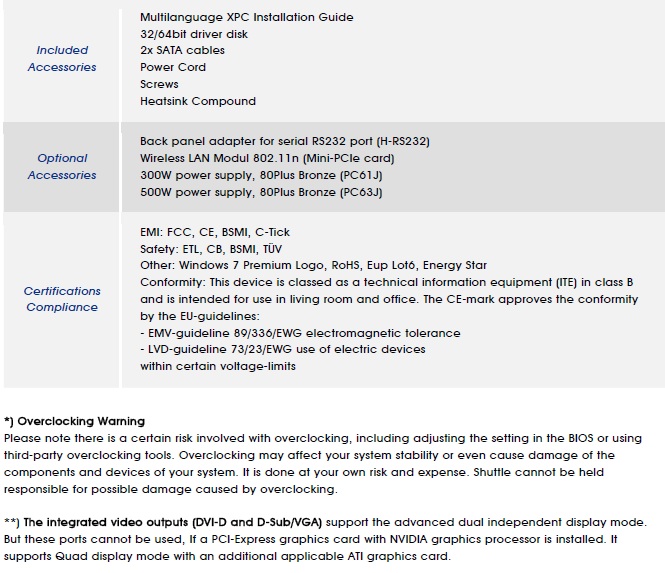 Il prodotto è inoltre conforme a numerose certificazioni. Tra le quali RoHS, Eup Lot6, Energy Star, a testimoniare l'attenzione dell'azienda Shuttle per la tematica ambientale e di risparmio energetico.