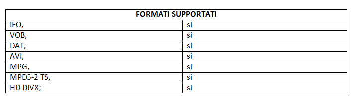 MPEG 1,2,4 MKV senza H264 (il che ci fa porre qualche domandina sull'utilità del supporto a tali file tali file), DivX (inclusi HD 1080p anche se non sappiamo come, essendo supportate dall’interfaccia video solo risoluzioni fino a 1080i), XviD.