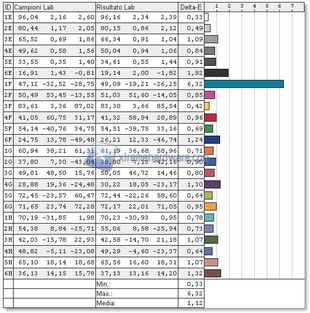 Il contrasto rimane ancora piuttosto basso, mentre migliorano di poco gli altri parametri; il valore medio del Delta-E passa da 1,75 a 1,12.