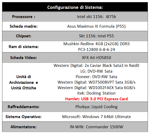 Per i test prestazionali ci siamo avvalsi dei componenti descritti nello schema in fondo alla pagina. Abbiamo usato per sfruttare l'Host Controller Card una scheda madre di Asus, esattamente il modello Maximus 3 Formula. Inoltre abbiamo usato per i test i dischi prodotti da da Western Digital ed una docking station prodotta da iTEK.