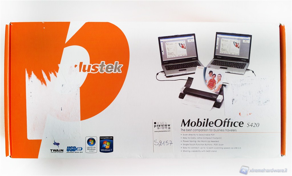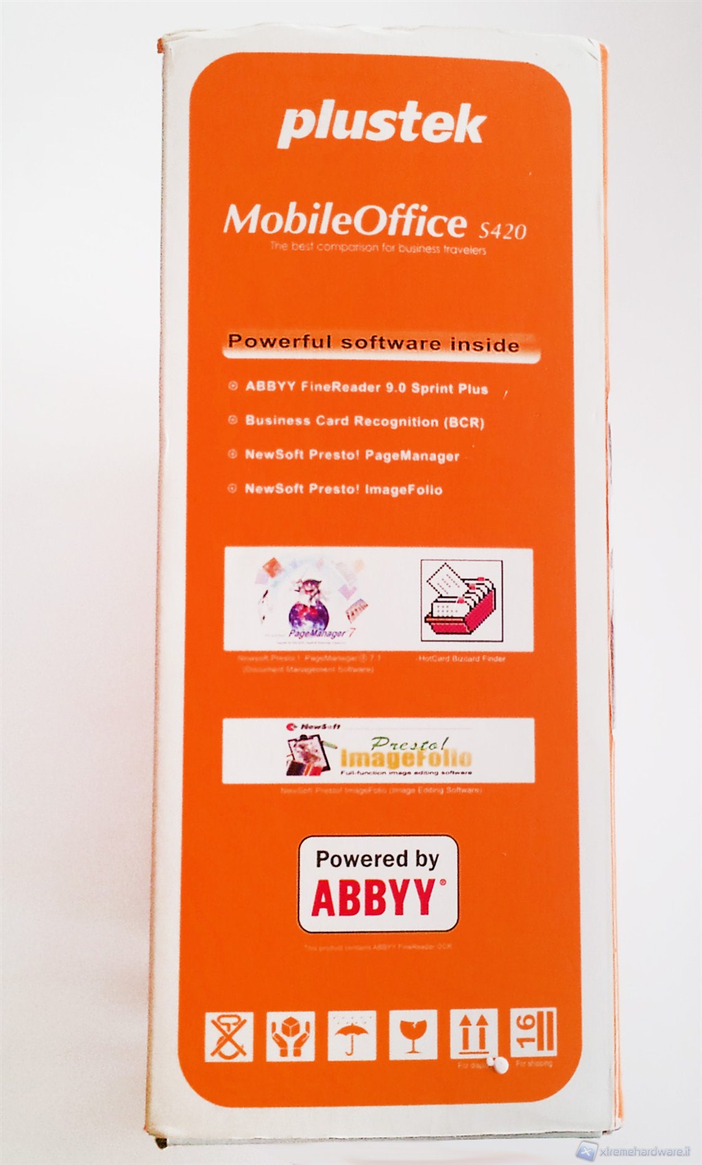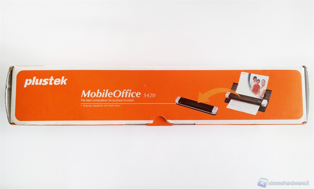 Il MobileOffice S420 prodotto da Plustek viene venduto all'interno di una confezione abbastanza compatta dalle dimensioni di 410 x 205 x 80 mm e caratterizzata dalla colorazione bianco-arancio tipica dell'azienda.